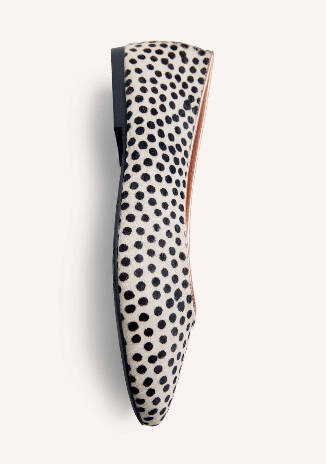 Leather ballet flats with a dalamtian print. Metallic interior. Round toe. Cushioned insole. This model stands out for its flexibility and lightness, as it eliminates heel counters and toe stops. Leather upper, lining, and insole. Flexible rubber sole.