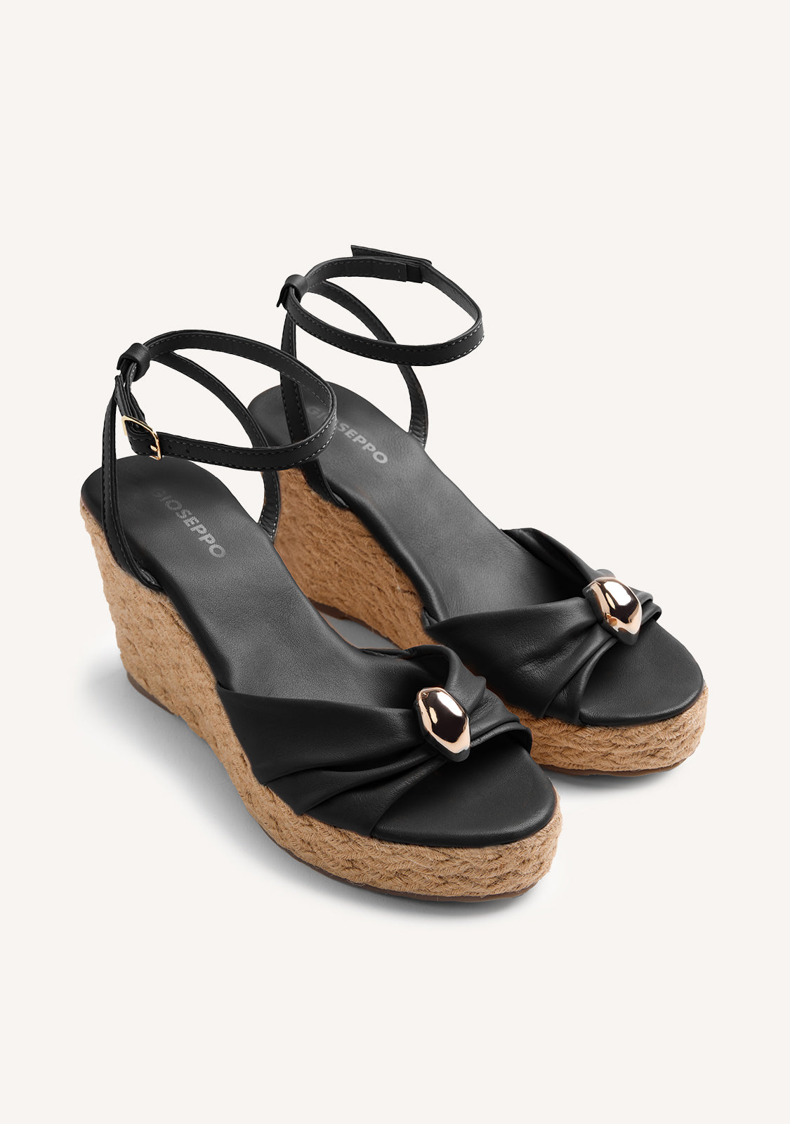 Leather sandals with jewel detailing. Wedge lined with braided raffia. They feature adjustable strap closures and a padded insole. Wedge height: 10 cm. Leather upper, lining, and insole. TPR sole.