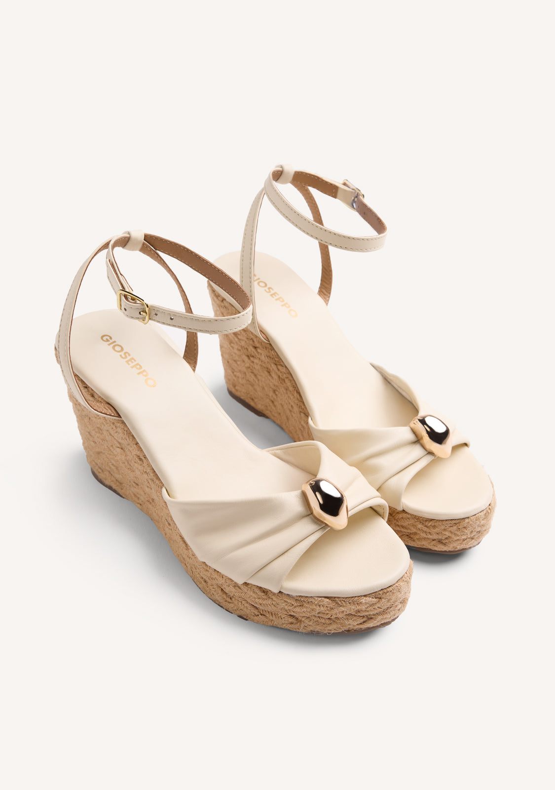 Leather sandals with jewel detailing. Wedge lined with braided raffia. They feature adjustable strap closures and a padded insole. Wedge height: 10 cm. Leather upper, lining, and insole. TPR sole.