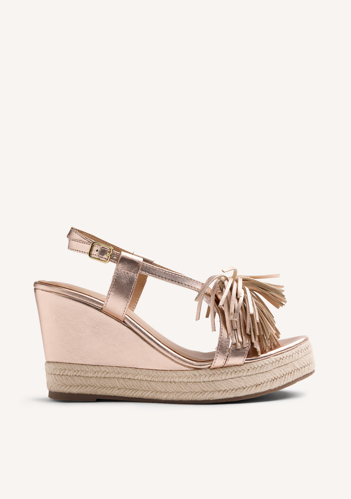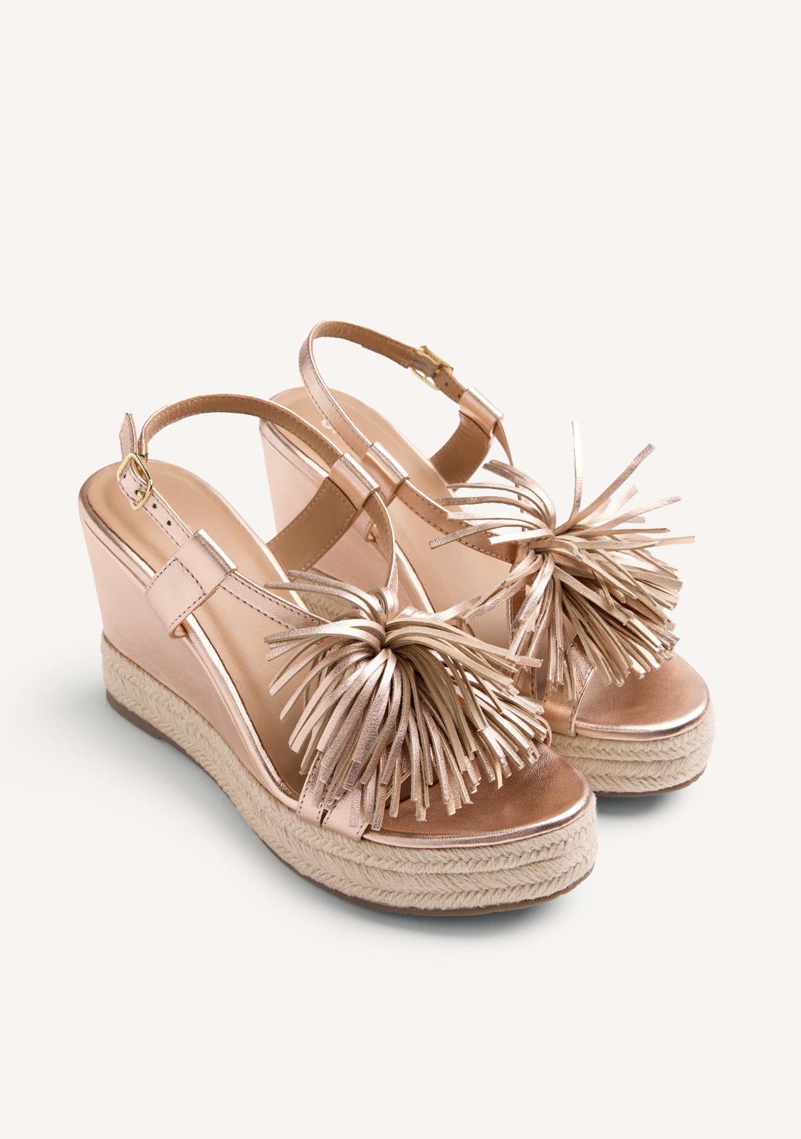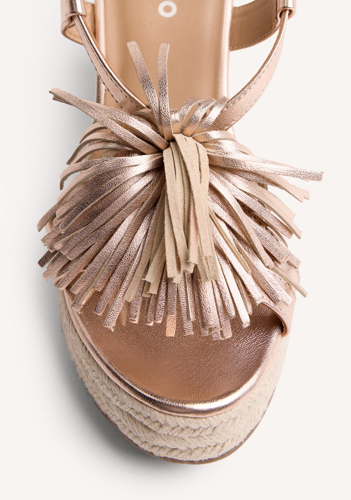 Metallic leather sandals with fringe detailing and a wedge heel. They feature adjustable ankle straps and a padded insole. Wedge height: 10 cm. Leather upper, lining, and insole. TPR sole.