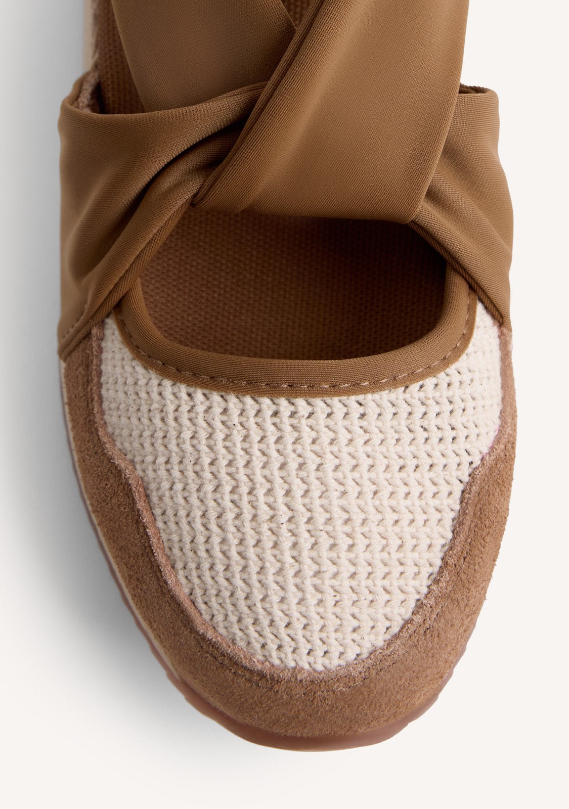 Open sneakers with suede leather, handmade crochet, and a jute-lined wedge. They feature a padded insole and support straps along the instep. Wedge height: 5.5 cm. Possible variations in the leather or finish between feet reflect the authenticity of the artisanal process and the use of natural leathers. Leather, breathable polyester, and polyurethane upper. Breathable recycled polyester lining and insole certified by the Global Recycled Standard. Lightweight EVA midsole. TPR outsole.