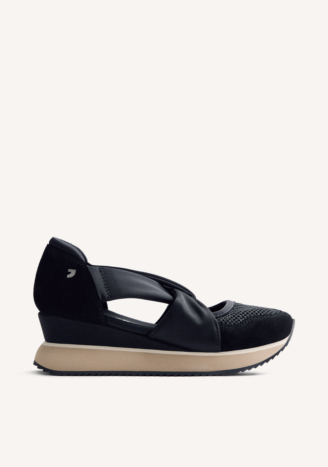 Open sneakers with suede leather and mesh. They feature a padded insole and support straps along the instep. Wedge height: 5.5 cm. Possible variations in the leather or finish between feet reflect the authenticity of the artisanal process and the use of natural leathers. Leather, breathable polyester, and polyurethane upper. Recycled breathable polyester lining and insole. TPR sole. Global Recycled Standard certification.