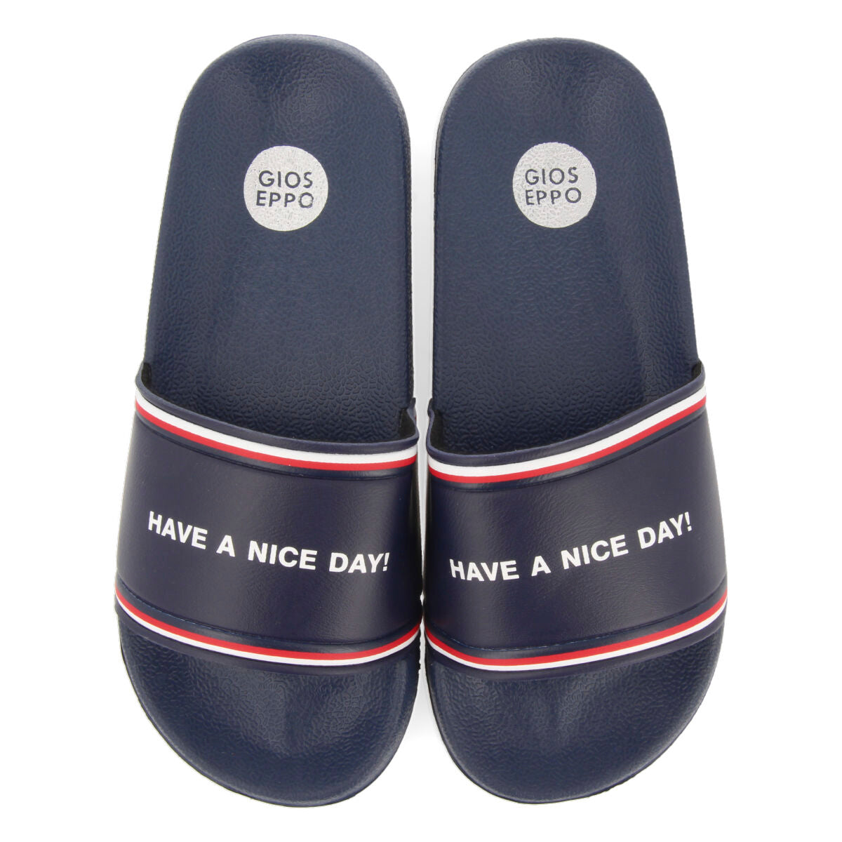 This model is a must-have for your shoe rack this summer: Navy blue mule flip flops with message " Have a Nice World". A basic! Waterproof. Super light.
