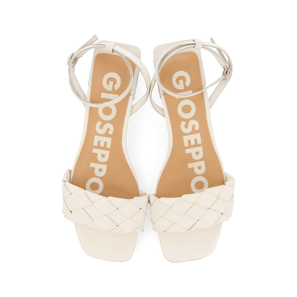 Off white leather sandals with 3 cm low heel, ankle strap and braided details. Insole padded with latex. Very flexible sole to ensure maximum comfort. Begins to set trend with the new Gioseppo woman collection.