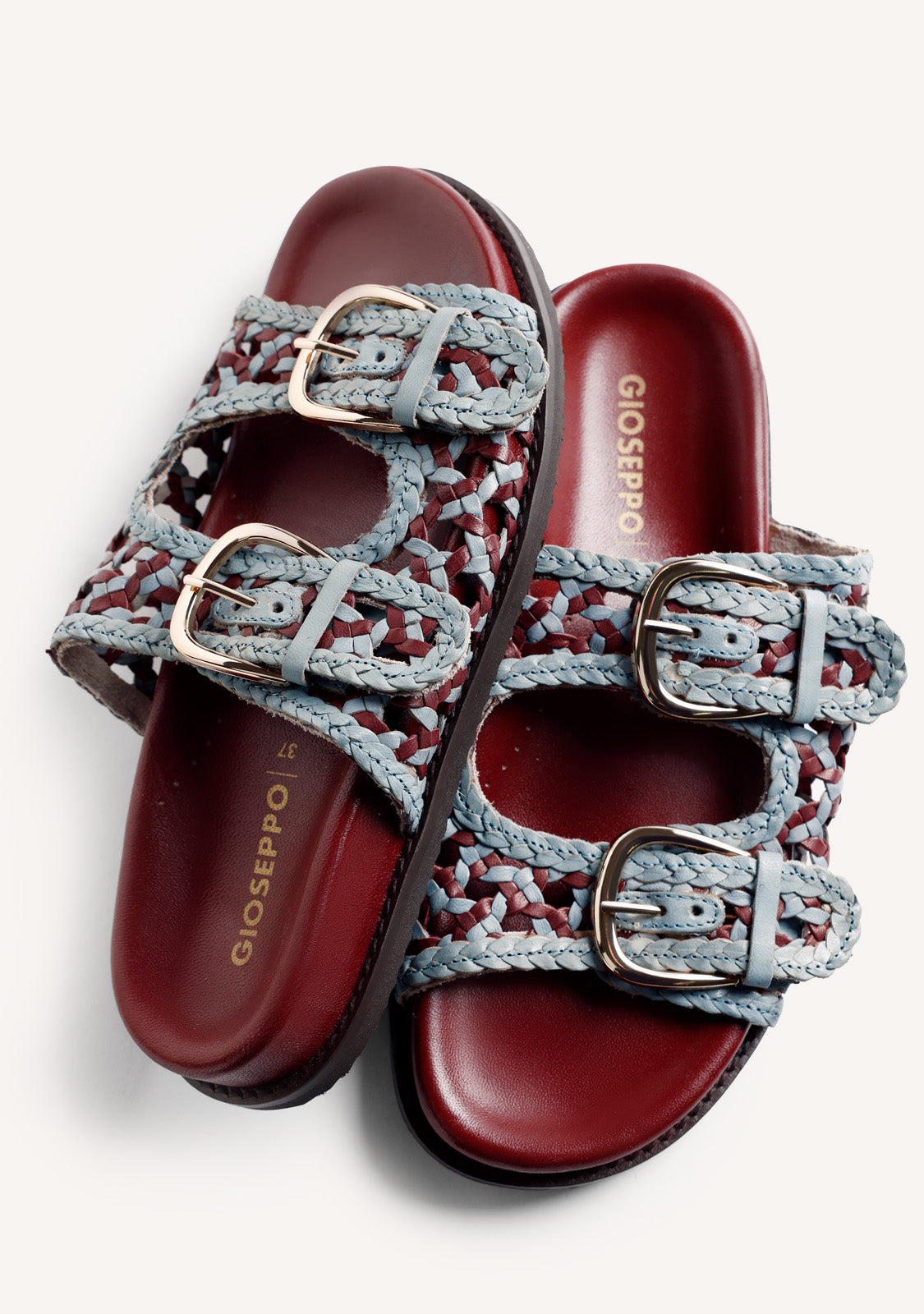 Leather sandals with handmade two-tone braiding and buckles. They feature a leather-lined bio-sole, ergonomically designed to distribute weight evenly. Leather upper, lining, and insole. Lightweight EVA sole.