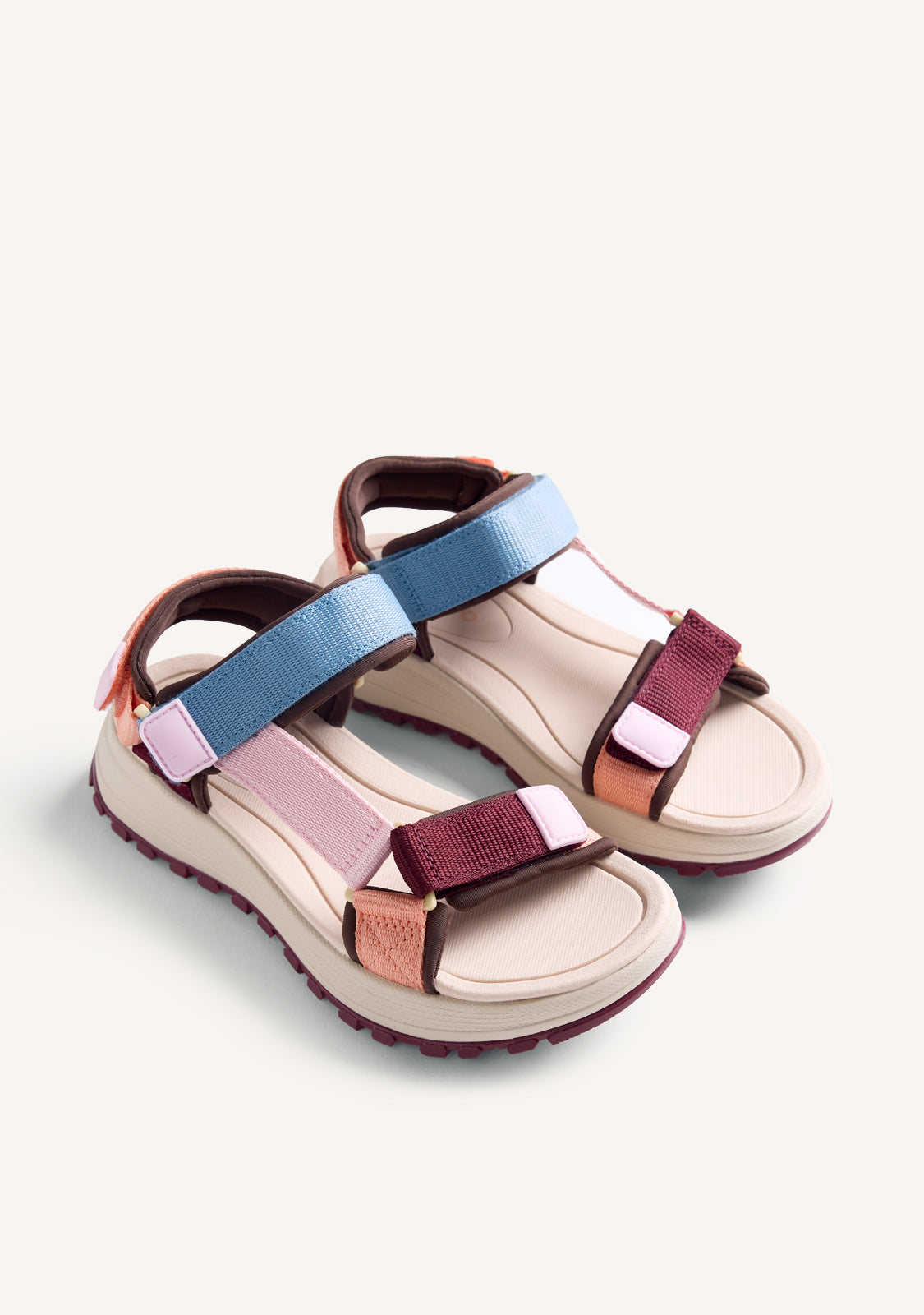 Californian-style platform sandals. Color contrasts. They feature a padded insole, adjustable ankle straps, and a track-style sole. Platform height: 4 cm. Polyurethane upper. Breathable polyester lining. Fylon insole, a cushioning, non-slip, and ultralight material. Flexible rubber sole.