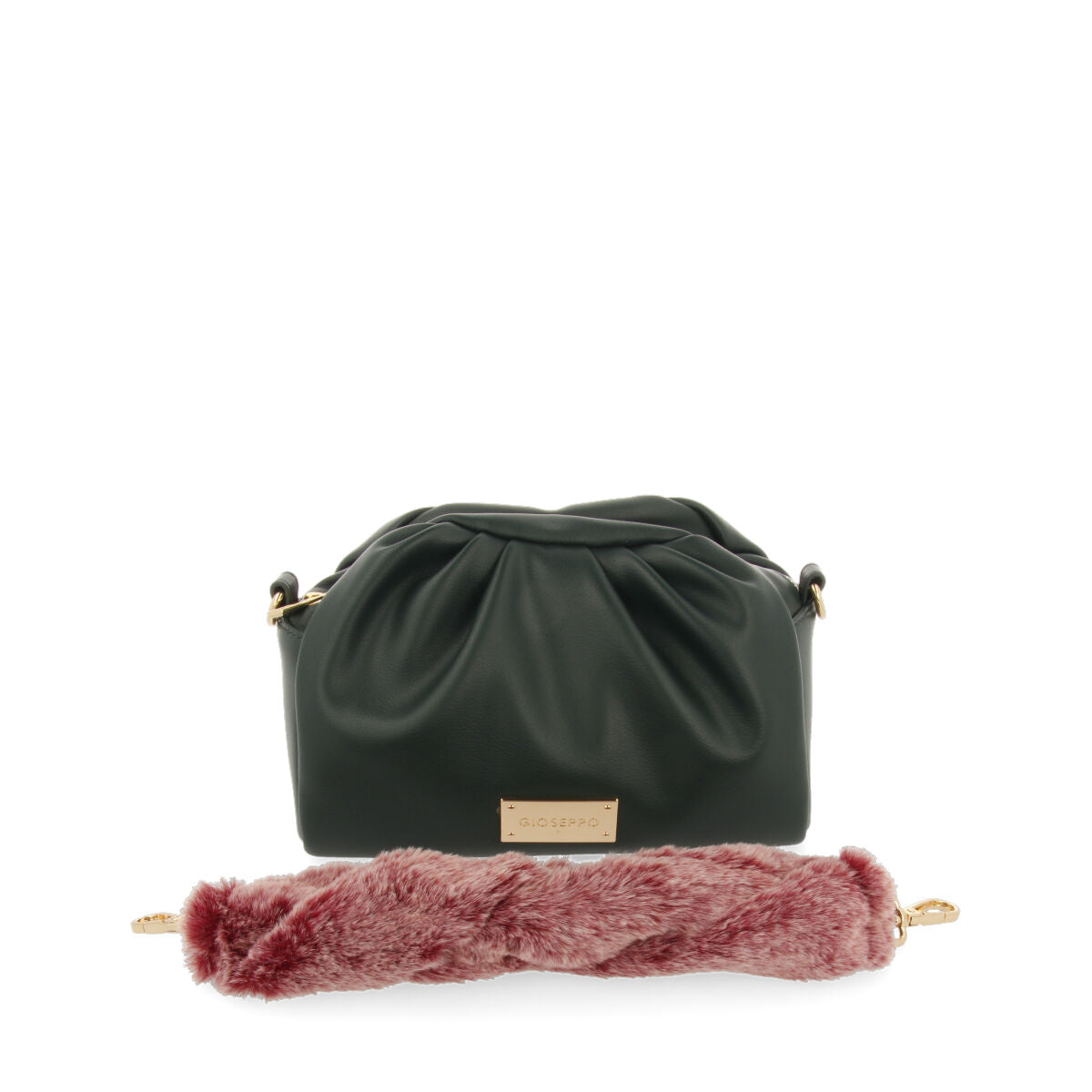 The cosy trend that will bring a touch of style to your looks. Frilly green bag with a short detachable furry pink handle. Also features a long detachable adjustable strap. Zip fastening. Don't miss out on the latest bags in the new Gioseppo Accessories Collection!