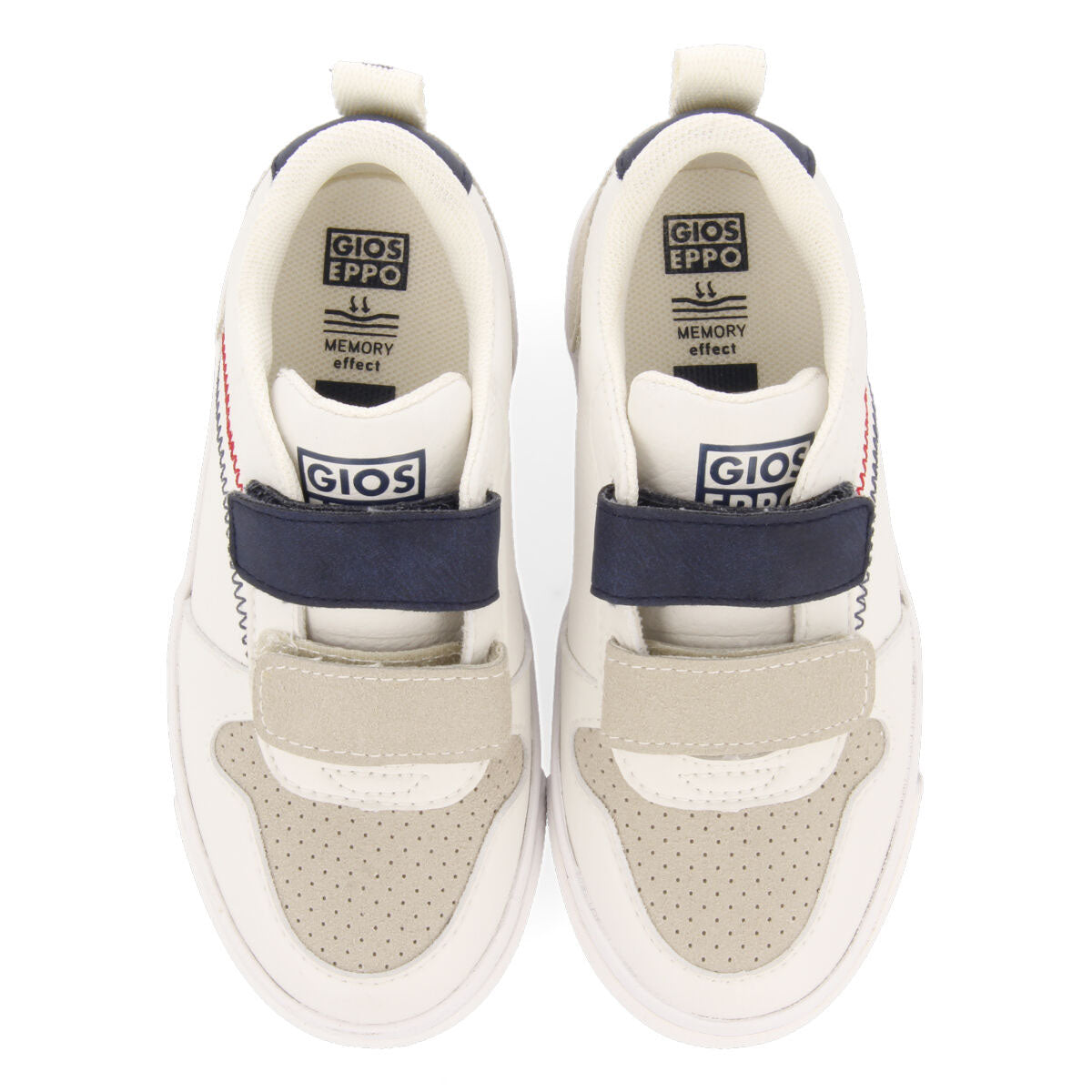 The trendiest sneakers this season! White sneakers in soft leather-effect synthetic material with suede details on the toe caps and backs. Navy blue heels and navy and red zigzag topstitching. The autoclave soles provide better support and feature colourful details. Adjustable fastenings to help children slip them on independently. The lining and inner soles are made from breathable recycled polyester and the soles are in natural cork. This model features our GIO Memory Effect insoles, which soften the gait and provide greater comfort.