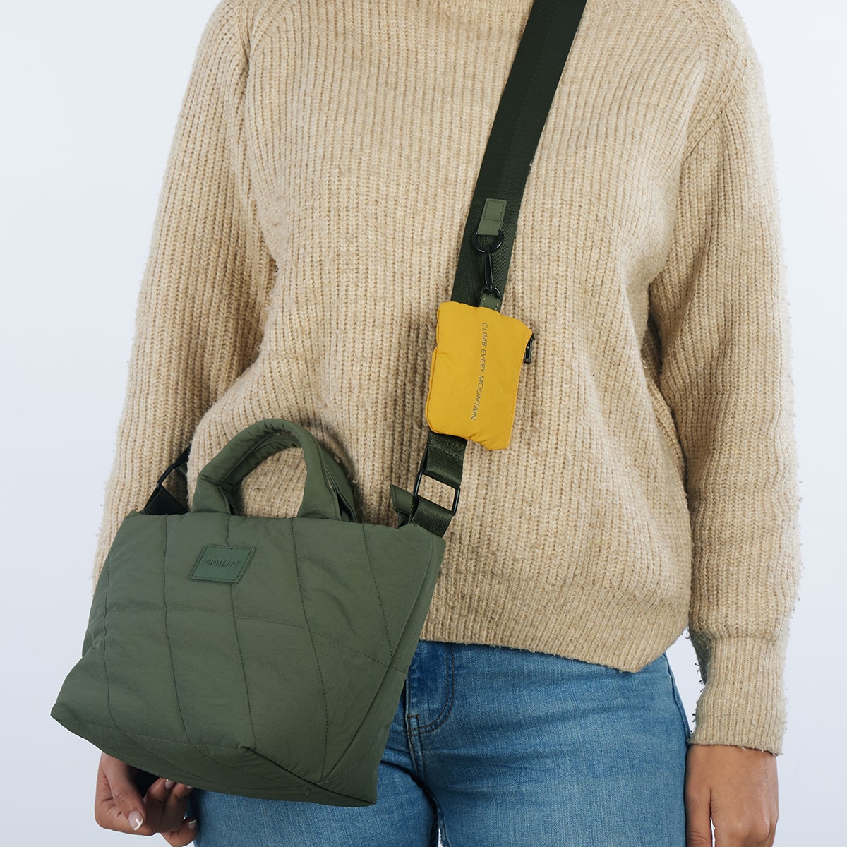 Comfy, light... and goes with all your looks! Quilted khaki bag made from recycled materials. Features a handle and detachable adjustable crossbody strap. Zip fastening. Detachable yellow hanging coin purse. Don't miss out on the latest bags in the new Gioseppo Accessories Collection!