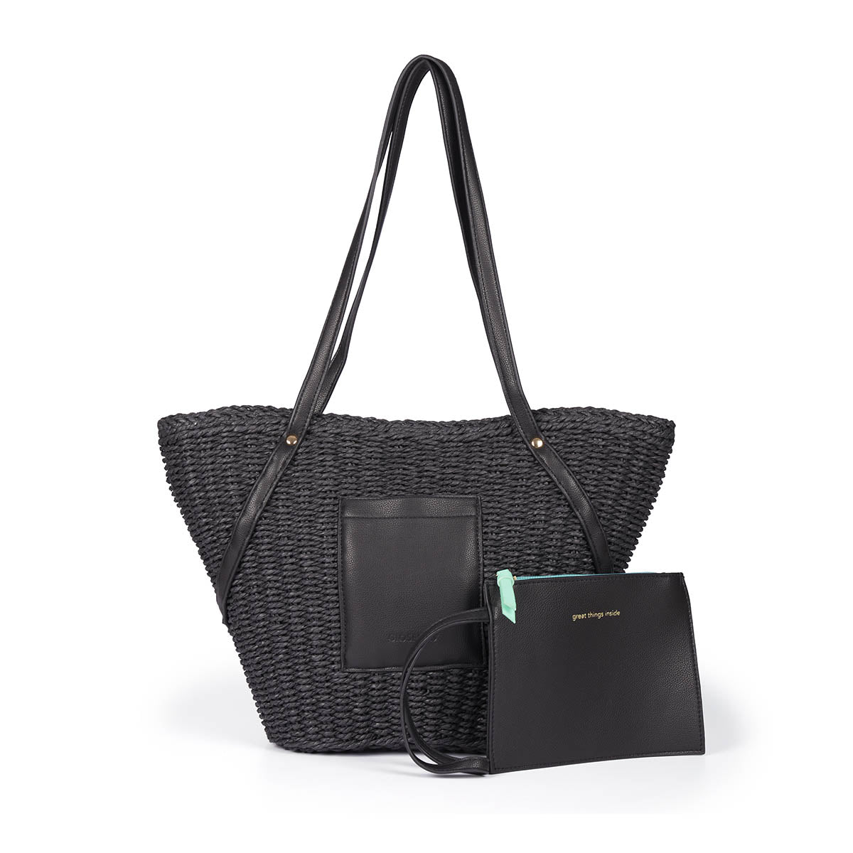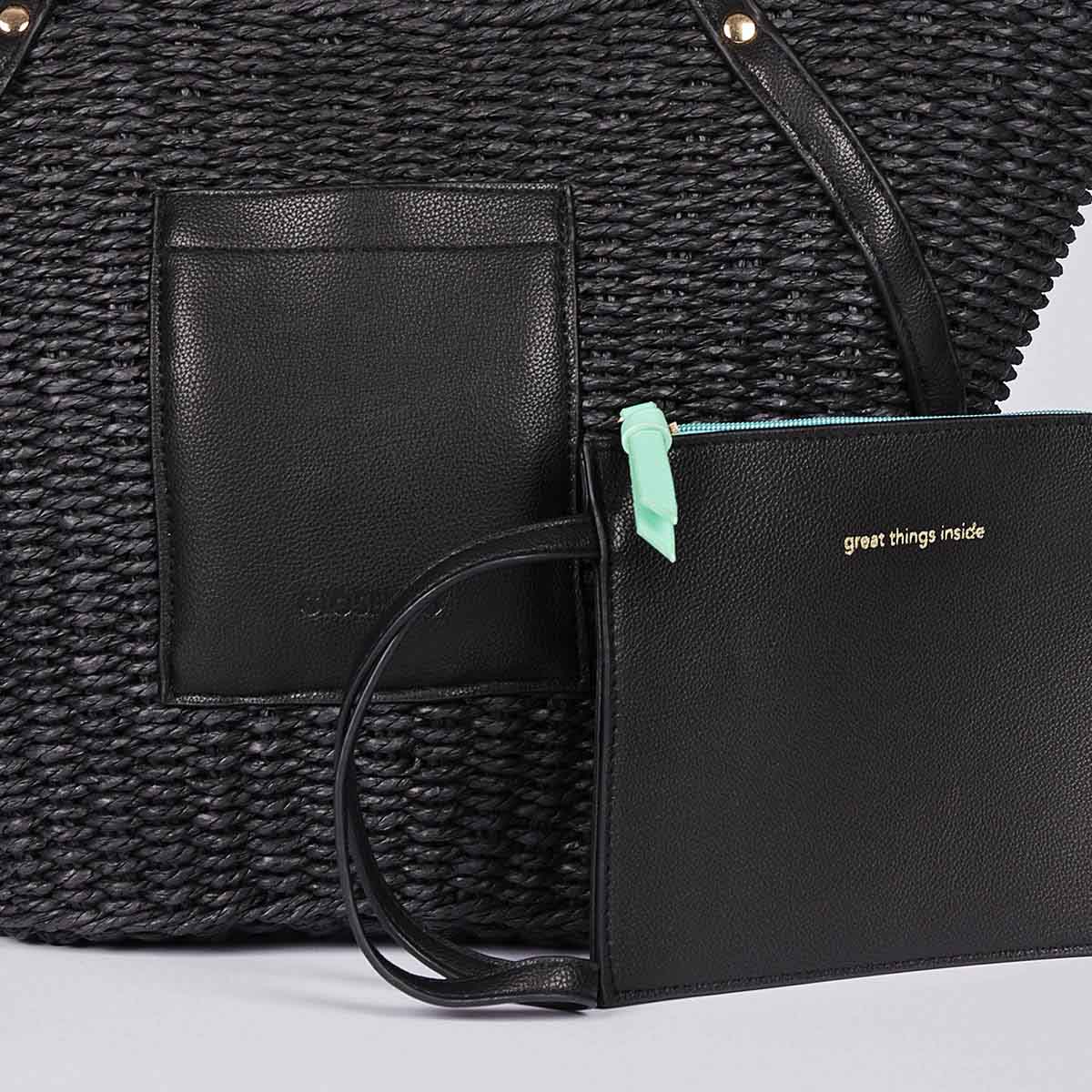 Explore this summer's raffia bags in the new Gioseppo Accessories SS23 Collection now. Natural raffia straw bag with black handles and a front pocket. Magnetic button fastening. Zipped inner pocket. Detachable zipped rectangular coin purse. Made of plant material with fabric lining.