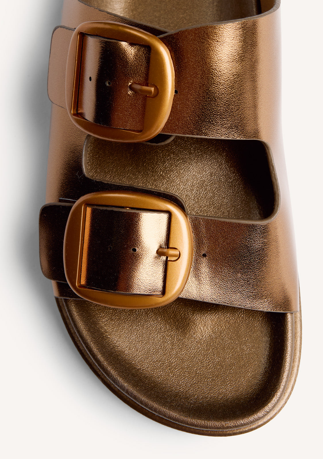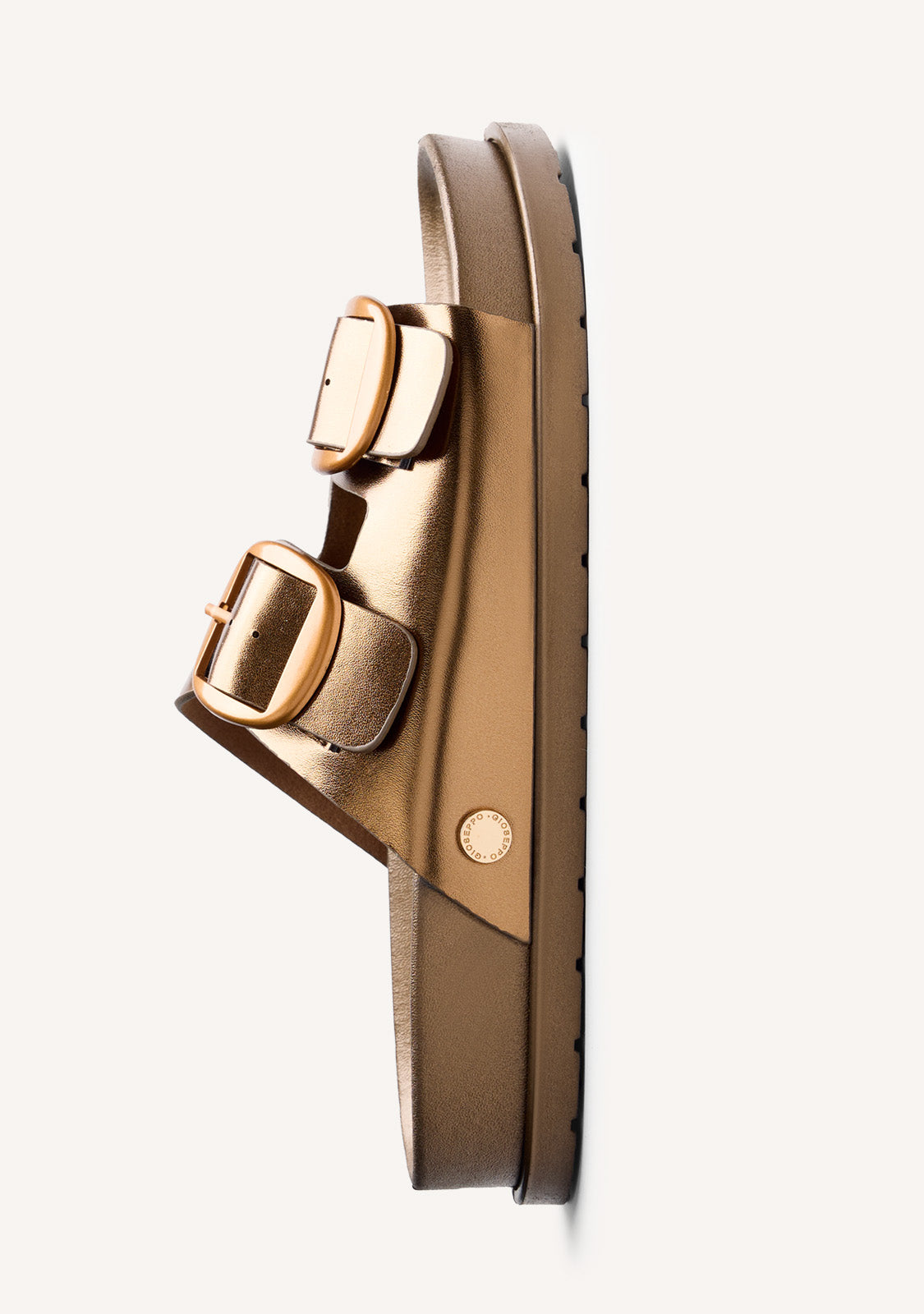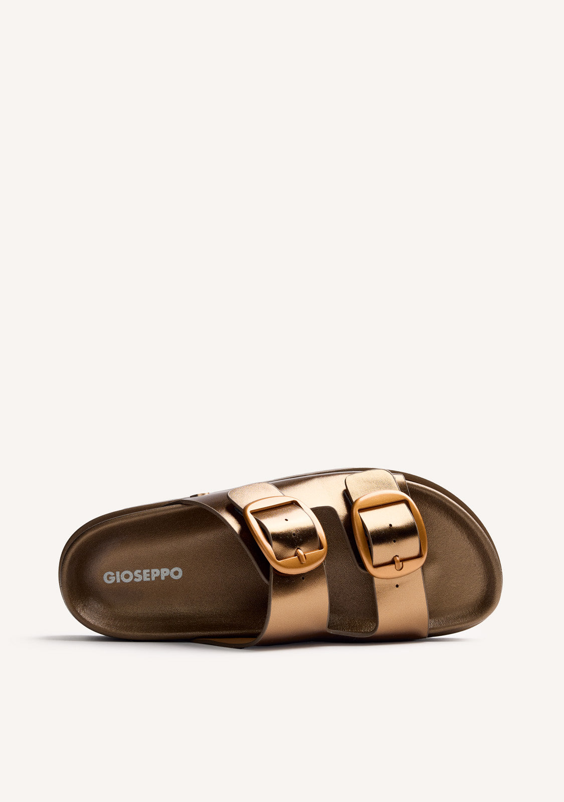 Metallic-finish sandals with buckles. They feature a lined, bio-inspired insole and an ergonomic design for even weight distribution. Platform height: 4 cm. Polyurethane upper and lining. Polyvinyl chloride insole and sole.