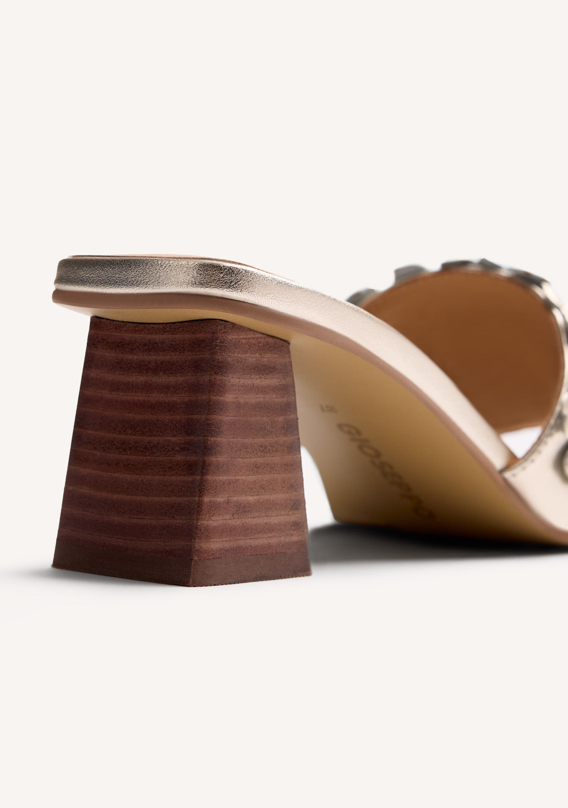 Hand-braided leather mule sandals with a metallic finish. Sculptural wooden heel. Cushioned insole. Heel height: 6 cm. Leather upper, lining, and insole. Flexible rubber sole.