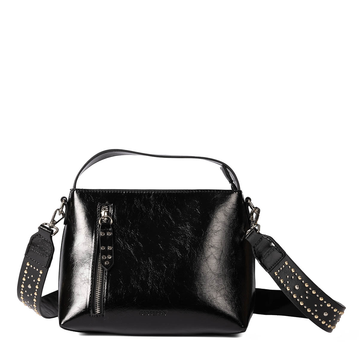 Discover groundbreaking rock chick styles. Black shopper bag with a handle and a long strap with decorative studs. Front zip-up pocket. Don't miss out on the latest bags in the new Gioseppo Accessories Collection!