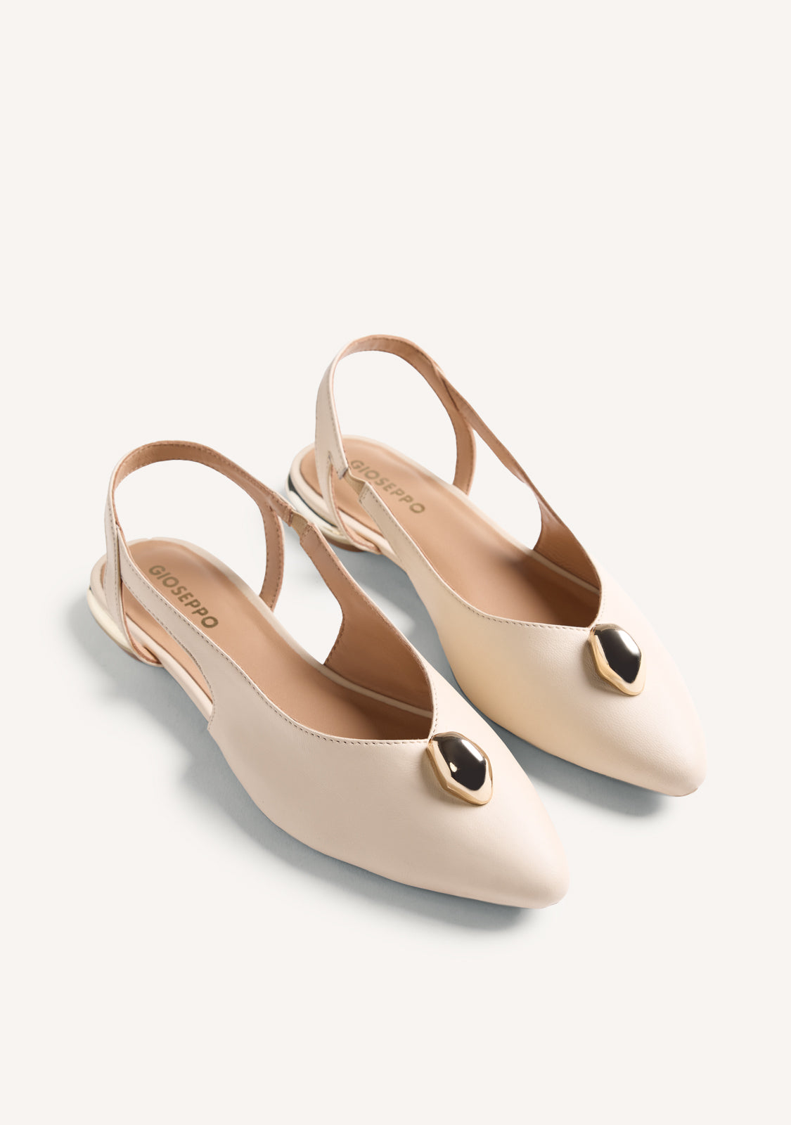Slingback leather ballet flats with jewel detailing. Rounded toe. Metallic heel. They feature a padded insole and ankle support strap. This model stands out for its flexibility and lightness, as it eliminates heel stops and counters. Leather upper, lining, and insole. Flexible TPR sole.