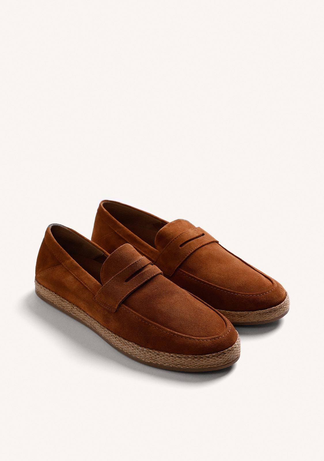 Monocolour suede leather loafers with a raffia-effect trim. Mask detail. They feature a removable, thermoformed insole to distribute body weight evenly across the sole. Platform height: 3 cm. Leather upper and insole. Leather and soft cotton lining. Flexible TPR sole.