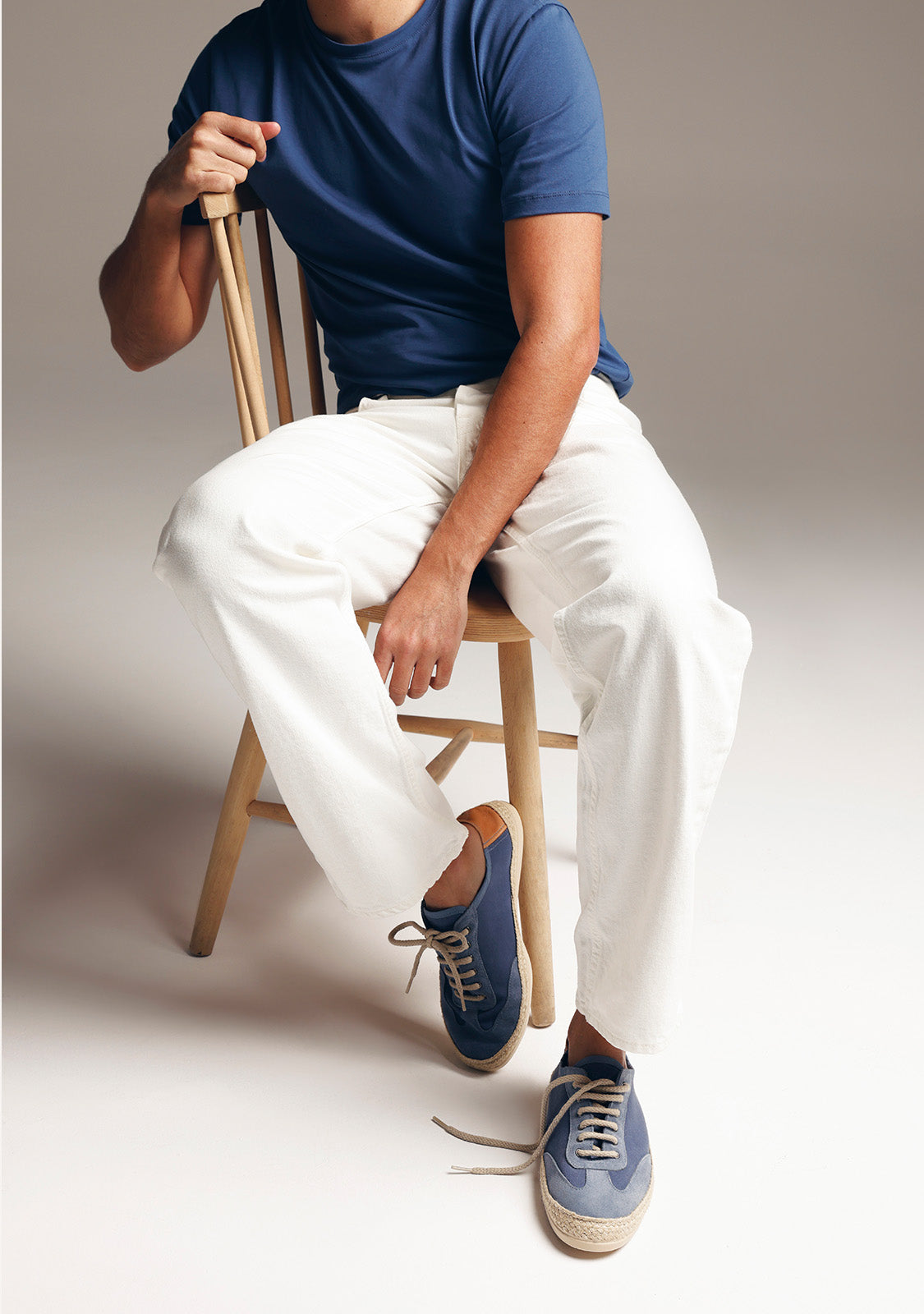 Blue sneakers with suede overlays and tubular laces. Moldable heel allows them to be worn as slippers. Rounded toe. Jute trim. They have a removable, cushioned insole. Platform height: 1.5 cm. Leather and cotton upper and lining. Leather insole. Flexible rubber sole.