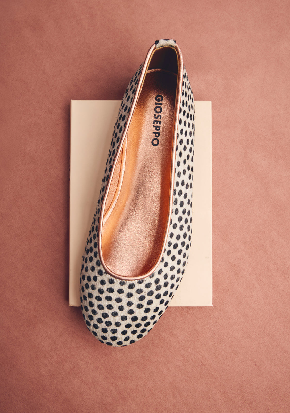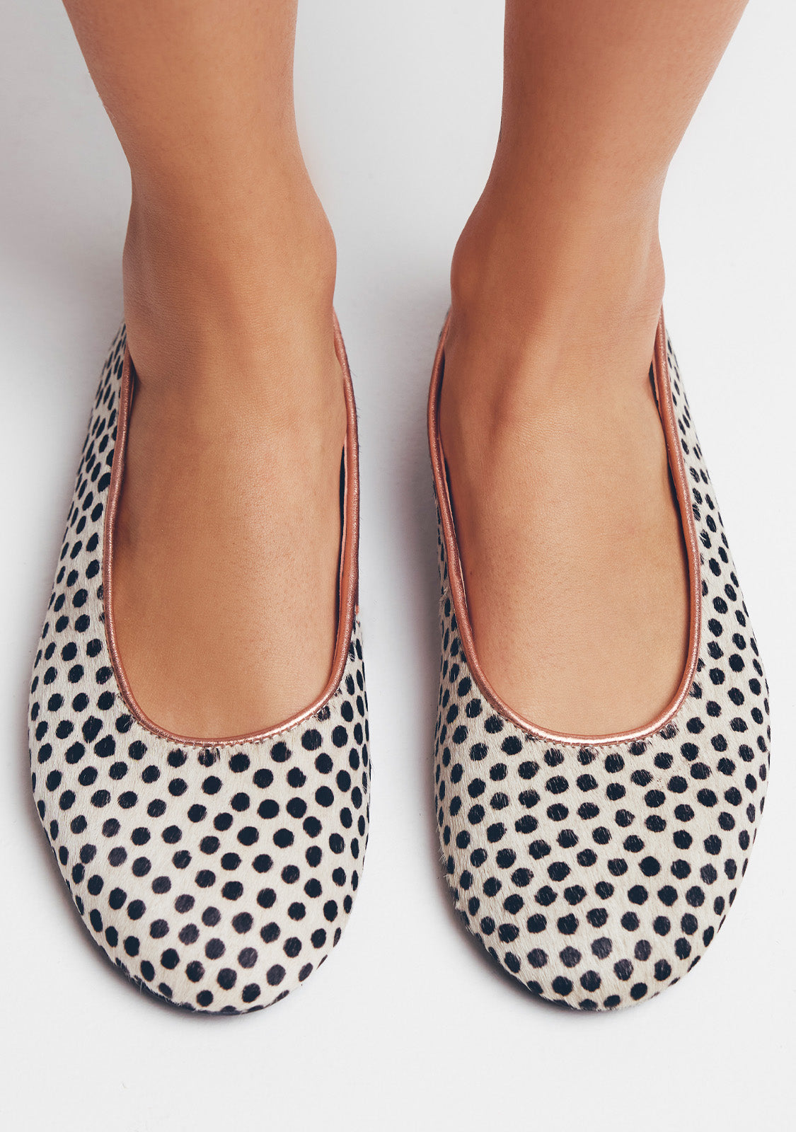 Bailarinas de piel tipo pelo con estampado de dálmata. Interior metalizado. Punta redonda. Cuentan con planta acolchada. Este modelo destaca por su flexibilidad y ligereza al prescindir de topes y contrafuertes.