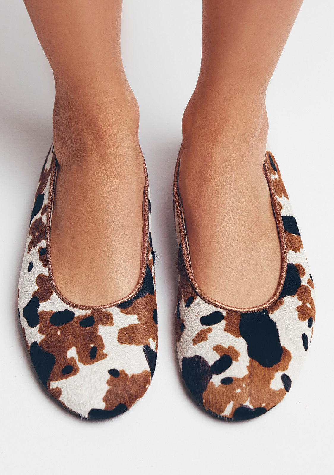 Bailarinas de piel tipo pelo con estampado de vaca. Interior metalizado. Punta redonda. Cuentan con planta acolchada. Este modelo destaca por su flexibilidad y ligereza al prescindir de topes y contrafuertes.