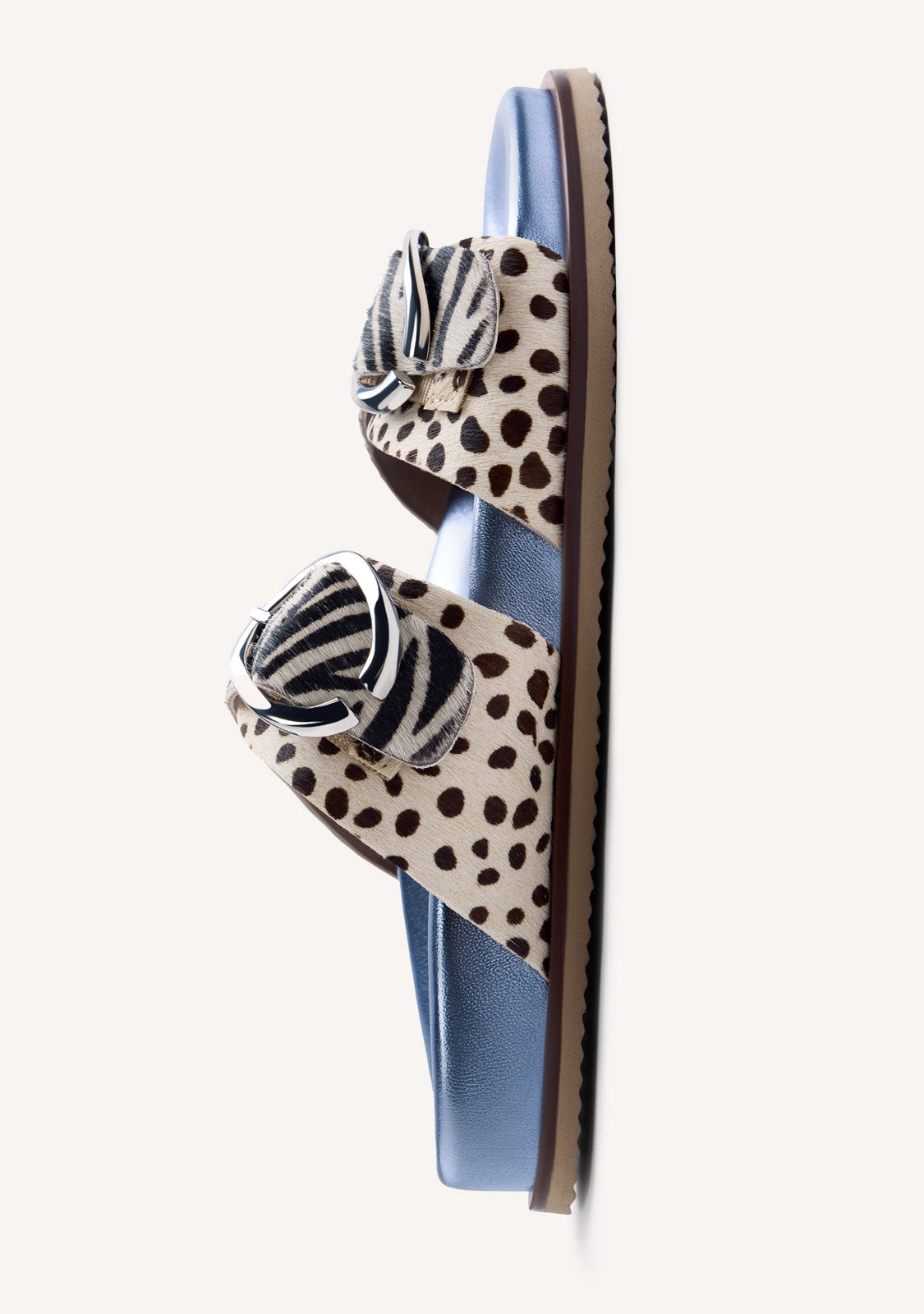 Sandalias de piel tipo pelo con estampado animal y hebillas. Cuentan con planta tipo bio forrada en piel metalizada, con diseño ergonómico para repartir el peso de manera equilibrada.