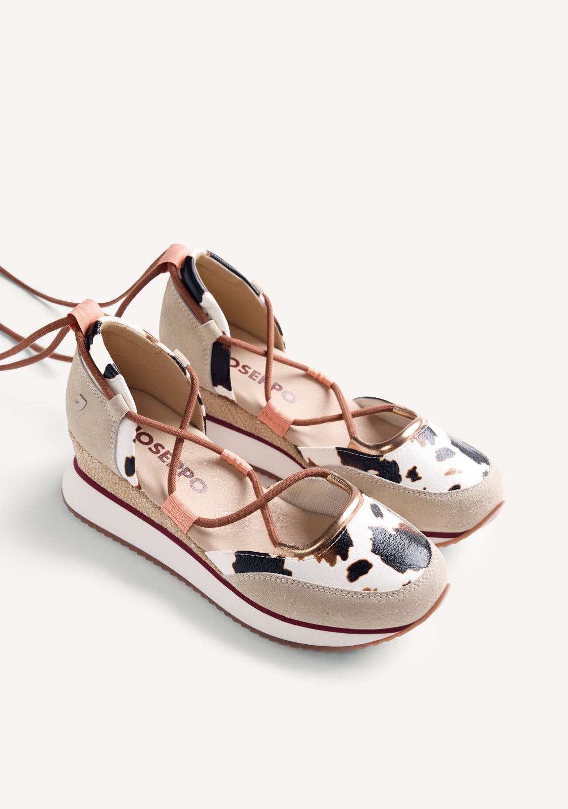 Zapatillas abiertas con piel serraje y cuña forrada estilo yute. Piezas de estampado de vaca, acentos de color y detalles metalizados. Cuentan con planta acolchada. Atadas con tiras. Altura cuña: 5,5 cm.
