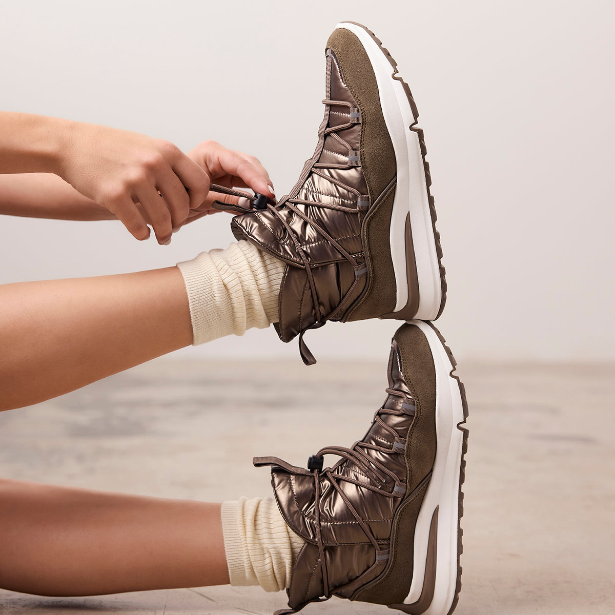 La tendencia que ha llegado para quedarse. Botas estilo Après Ski marrones. Los cordones combinan con la base acolchada y metalizada. Disponen de suela de EVA inyectada y plantilla anatómica, extraíble y con sistema Gio Memory Effect para suavizar cada pisada. La hilatura de los tejidos utilizados en la fabricación del forro de este modelo tiene el sello de garantía certificada Global Recycle Standard (GRS). ¡El frío no se te resistirá!
