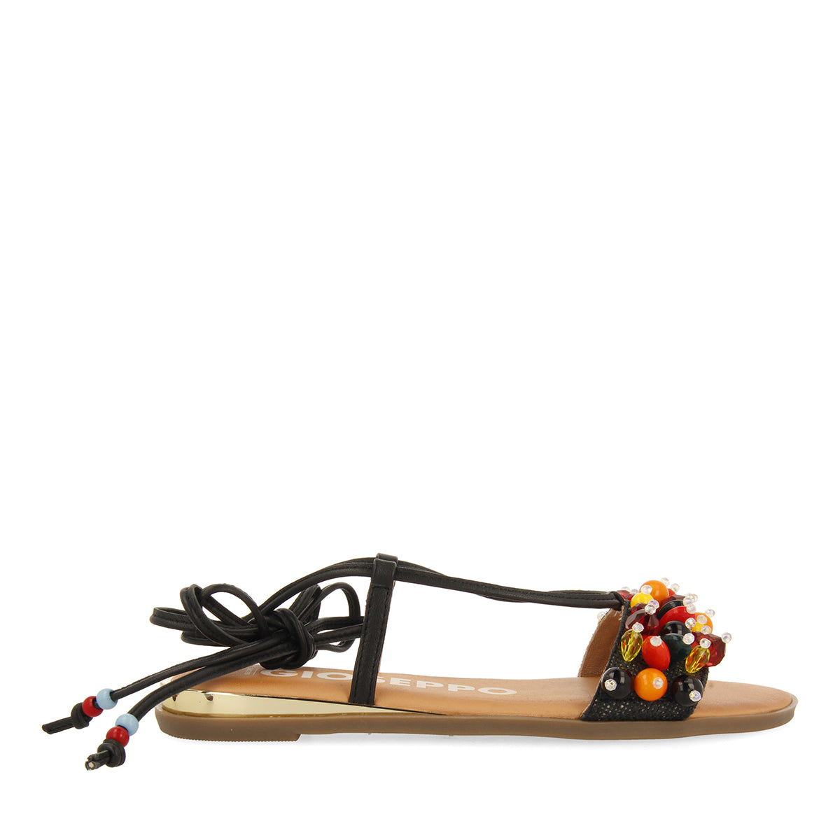 SANDALIAS NEGRAS DE PIEL CON ADORNOS MULTICOLOR Y TIRAS PARA MUJER KLOS