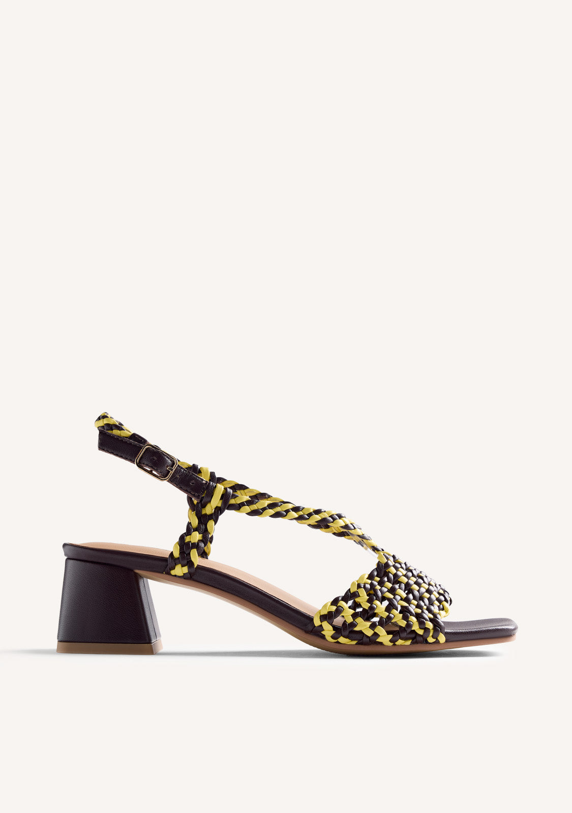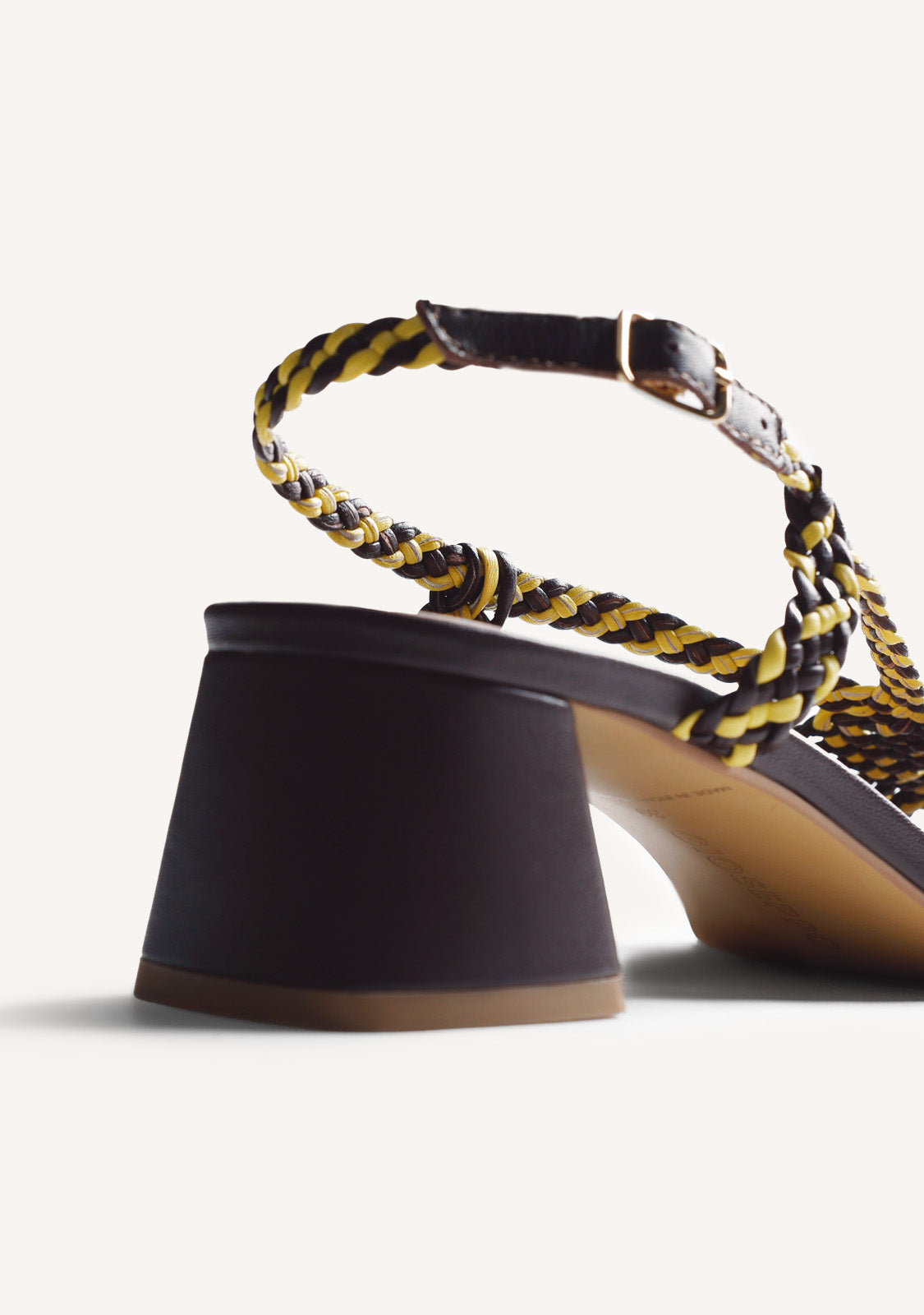 Sandalias de piel bicolor trenzada a mano. Tacón tipo bloque. Cuentan con planta acolchada y cierres ajustables en el tobillo. Altura tacón: 4,5 cm.