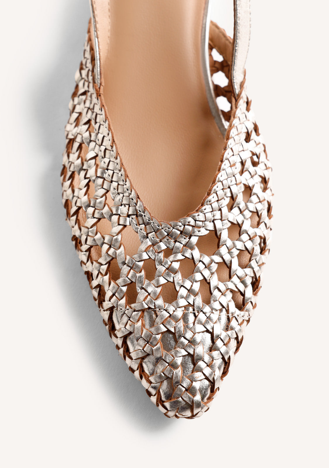 Zapatos de tacón estilo salones destalonados de piel trenzada a mano. Punta afilada. Tacón tipo bloque en forma de trapecio. Cuentan con planta acolchada y cierres ajustables en el tobillo. Altura tacón: 3 cm.