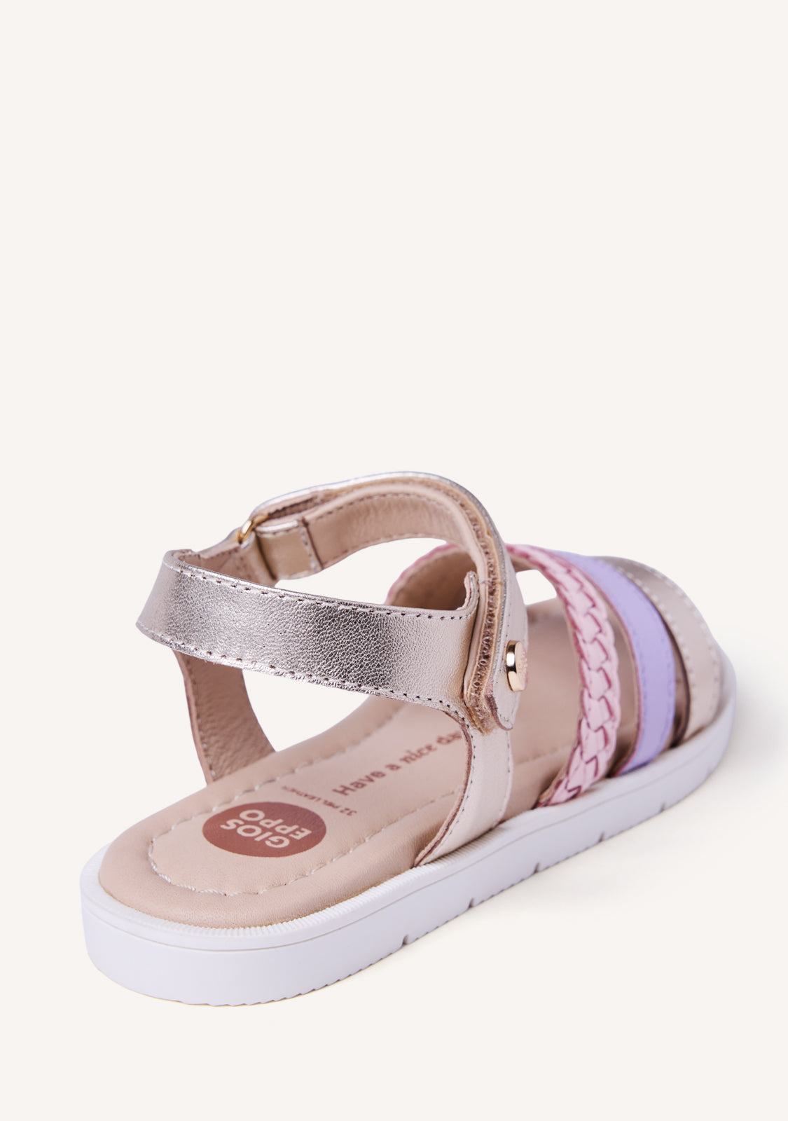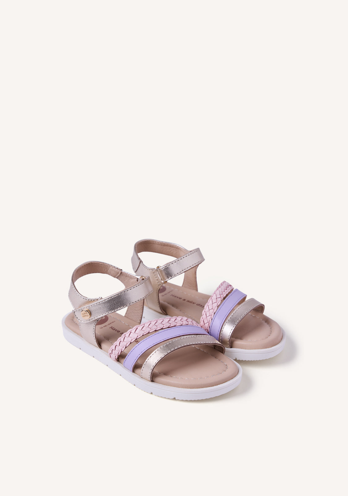 Sandalias de piel con trenzado. Tiras multicolores y detalles metalizados. Cuentan con cierres ajustables en el tobillo y planta acolchada. Las posibles arrugas y diferencias en la piel o en el montado entre ambos pies son debidas al proceso artesanal y al uso de pieles naturales.