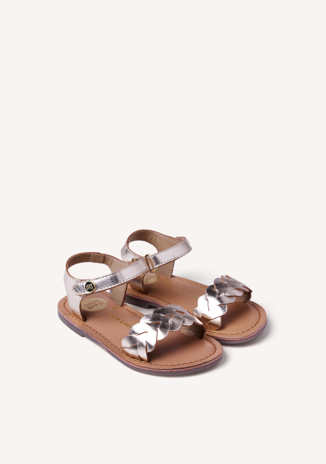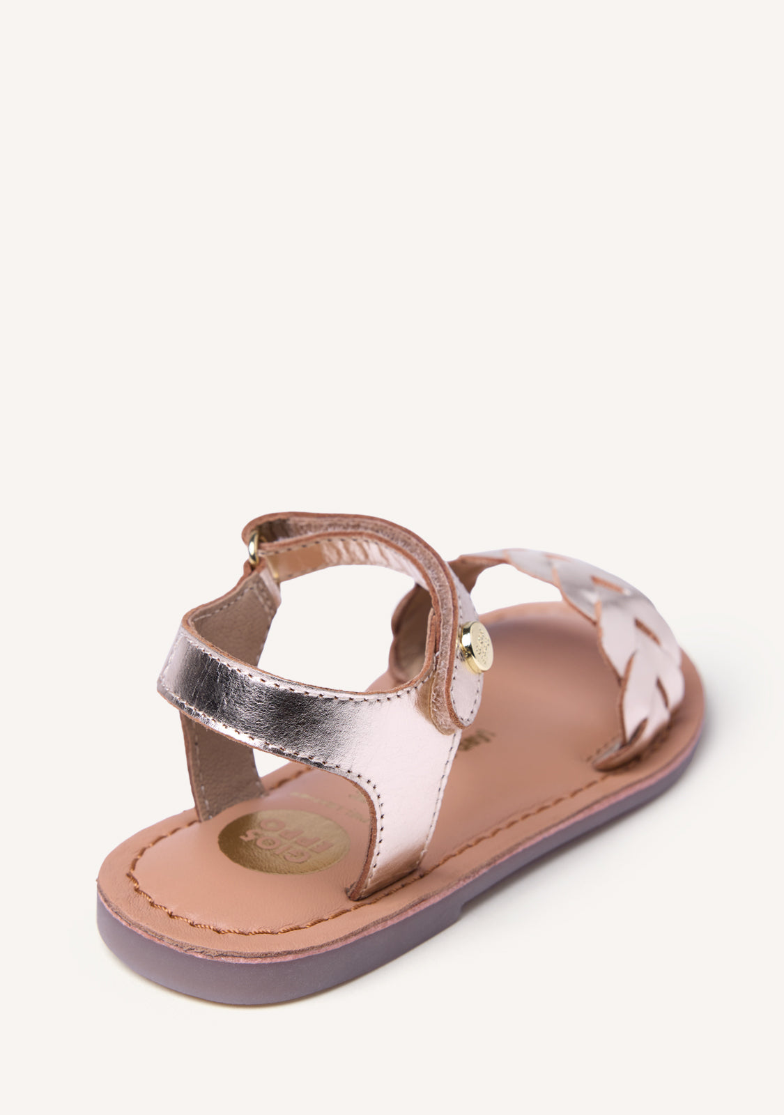 Sandalias de piel metalizada con trenzado artesanal. Cuentan con cierres ajustables en el tobillo. Las posibles arrugas y diferencias en la piel o en el montado entre ambos pies son debidas al proceso artesanal y al uso de pieles naturales.