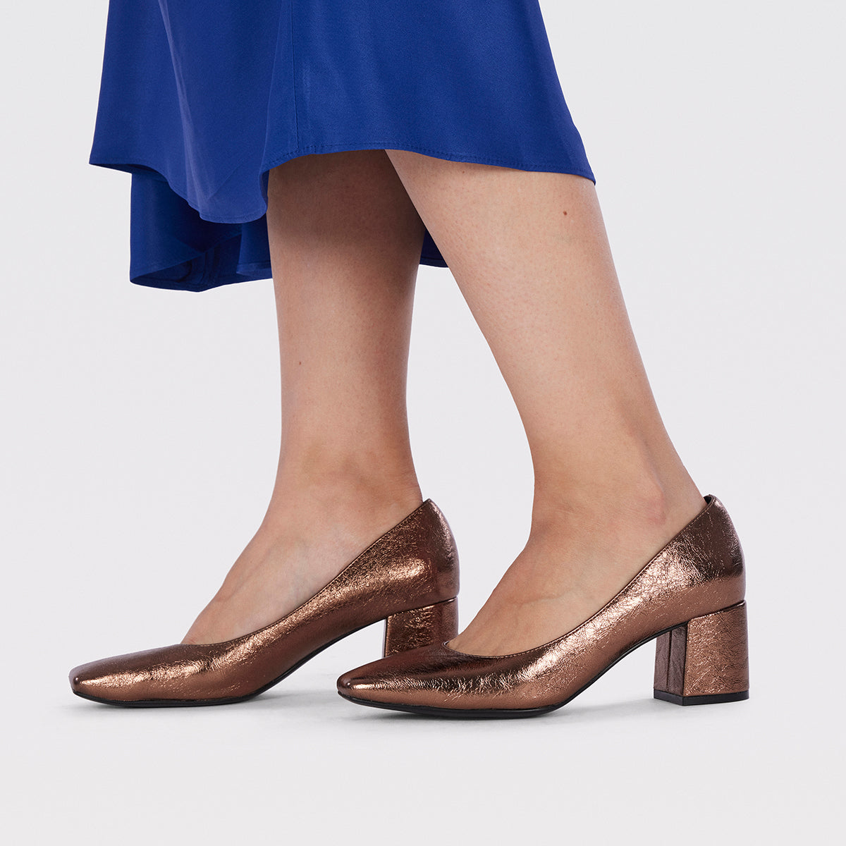 ¿Buscas un básico para tus looks más elegantes? Zapatos de salón color bronce con puntera semicuadrada y tacón medio. Plantilla de piel acolchada de látex. Piso flexible. Descubre lo último en calzado de mujer en la nueva colección de Gioseppo Woman.