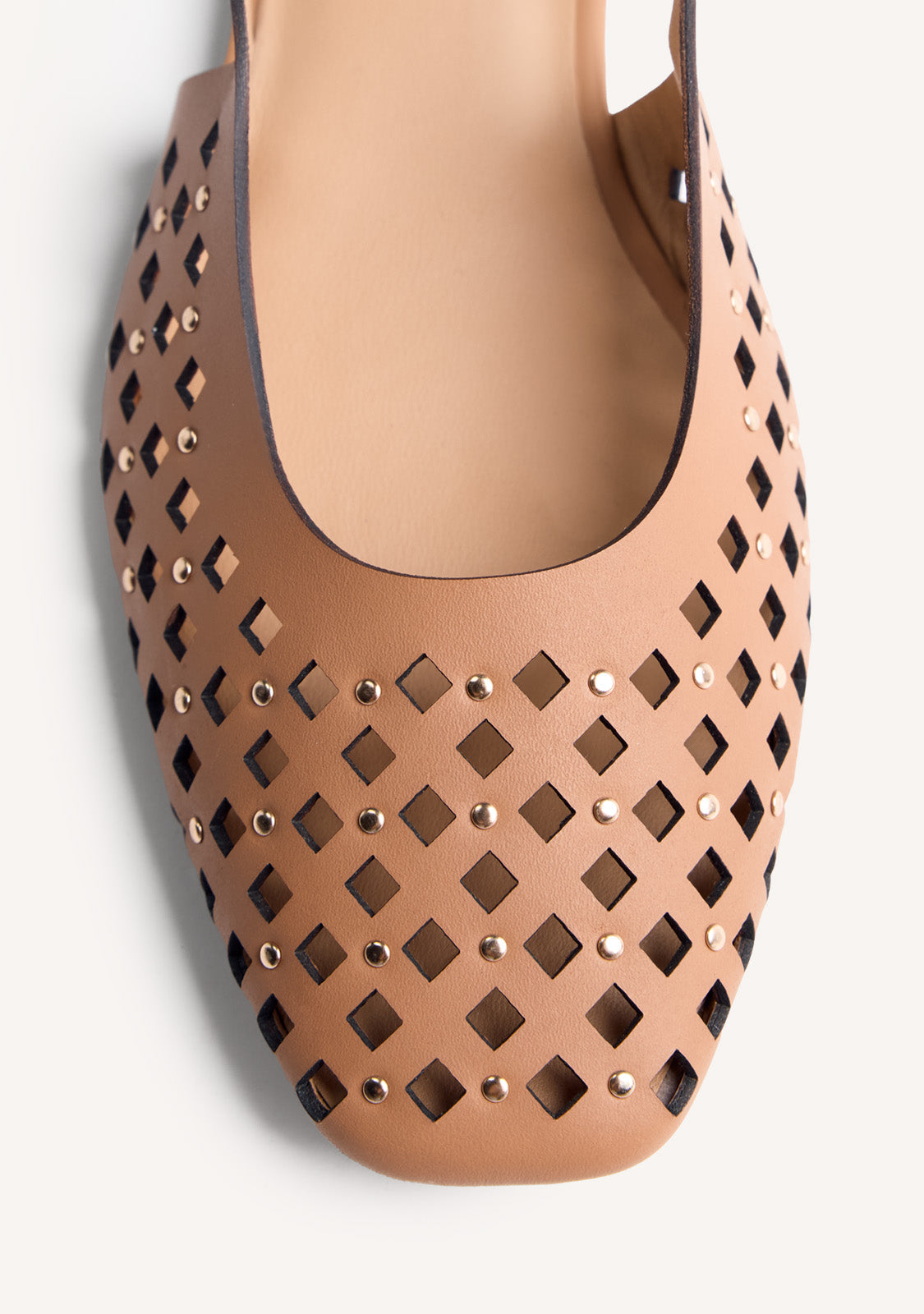 Bailarinas destalonadas de piel calada con detalle de tachas. Punta cuadrada. Cuentan con planta acolchada y cierres ajustables en el tobillo. Este modelo destaca por su flexibilidad y ligereza al prescindir de topes y contrafuertes.