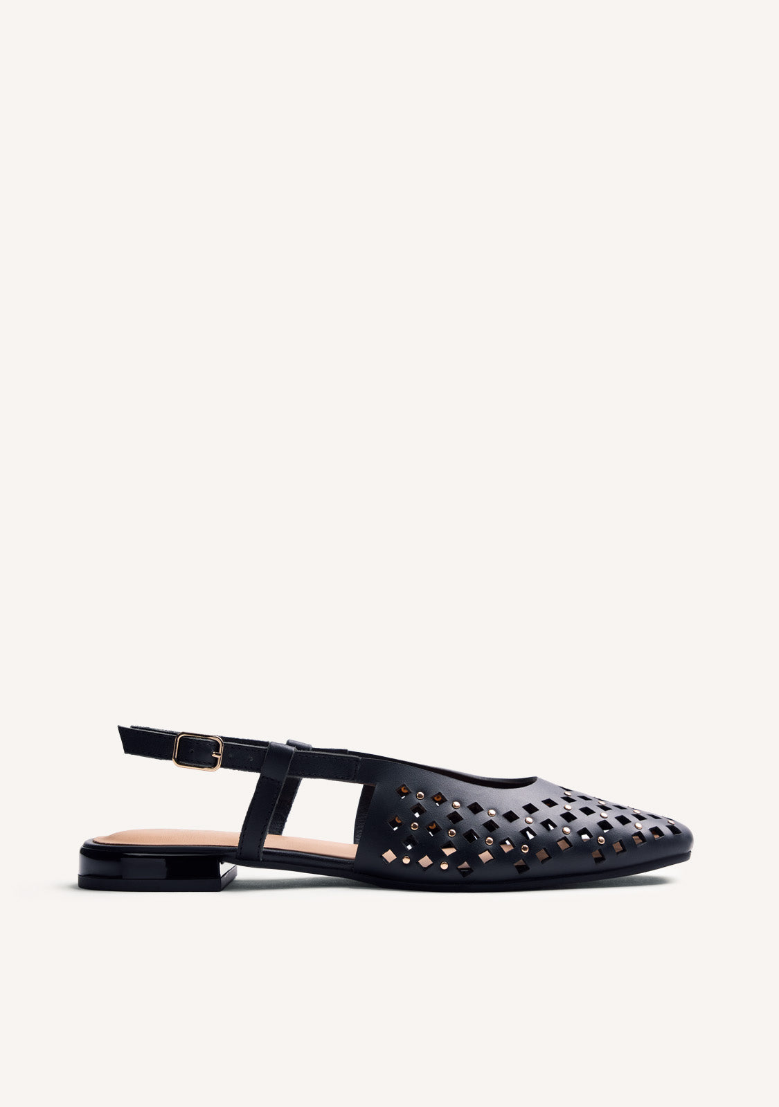 Bailarinas destalonadas de piel calada con detalle de tachas. Punta cuadrada. Cuentan con planta acolchada y cierres ajustables en el tobillo. Este modelo destaca por su flexibilidad y ligereza al prescindir de topes y contrafuertes.