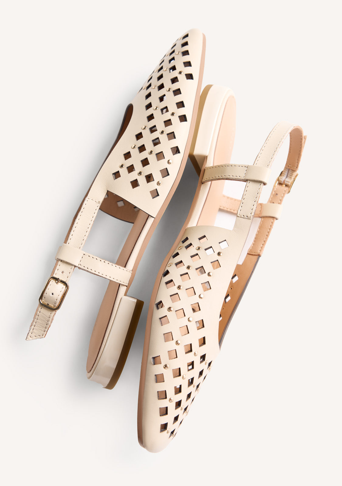 Bailarinas destalonadas de piel calada con detalle de tachas. Punta cuadrada. Cuentan con planta acolchada y cierres ajustables en el tobillo. Este modelo destaca por su flexibilidad y ligereza al prescindir de topes y contrafuertes.