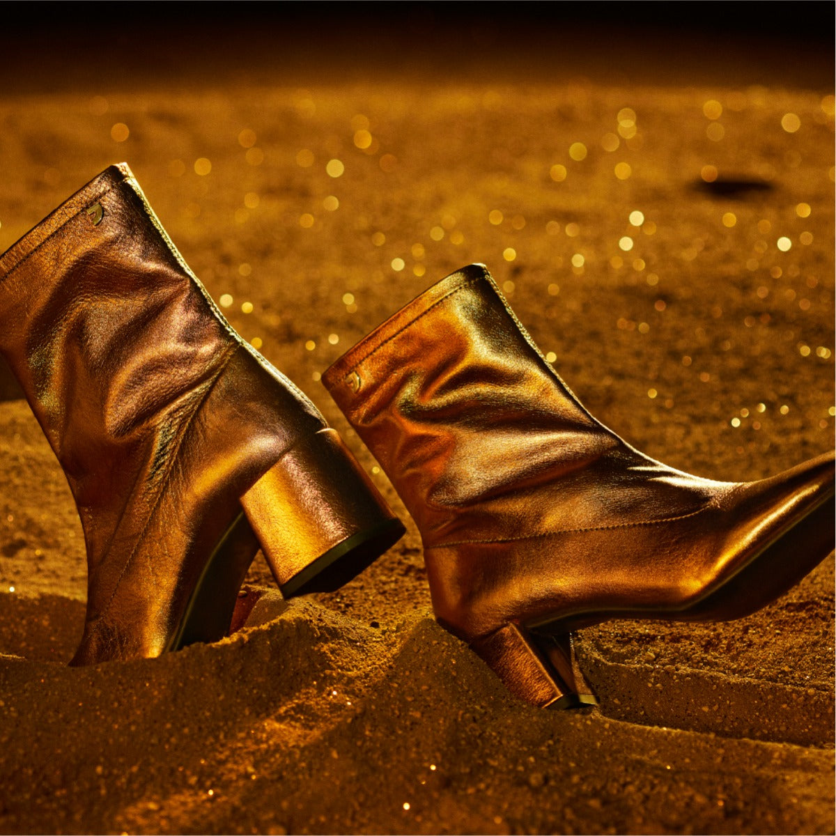 ¡Brilla por ti misma con nuestros botines! Botines de tacón medio y punta redondeada en piel metalizada color bronce. Planta con fibras naturales. Plantilla acolchada de látex. Plantilla y forro de piel curtidos en tenerías que siguen un proceso de curtición más sostenible bajo los estándares de Leather Working Group. Hazte con el botín más versátil y único de la colección.
