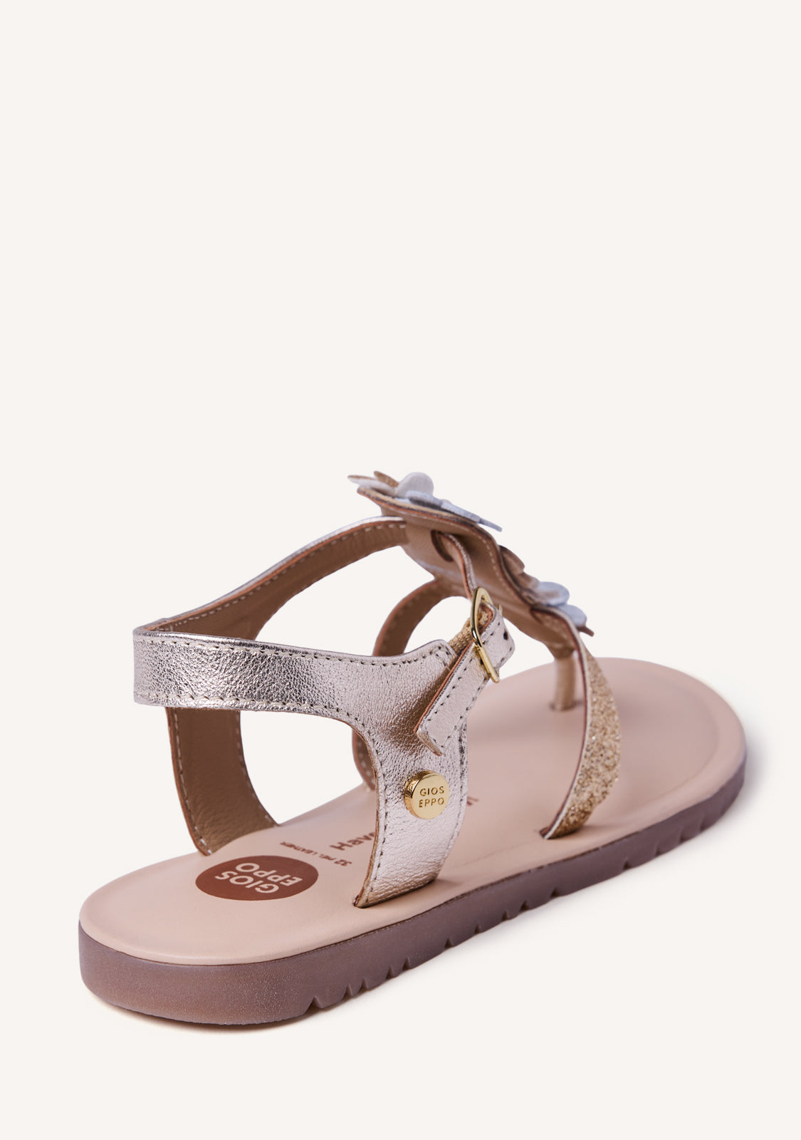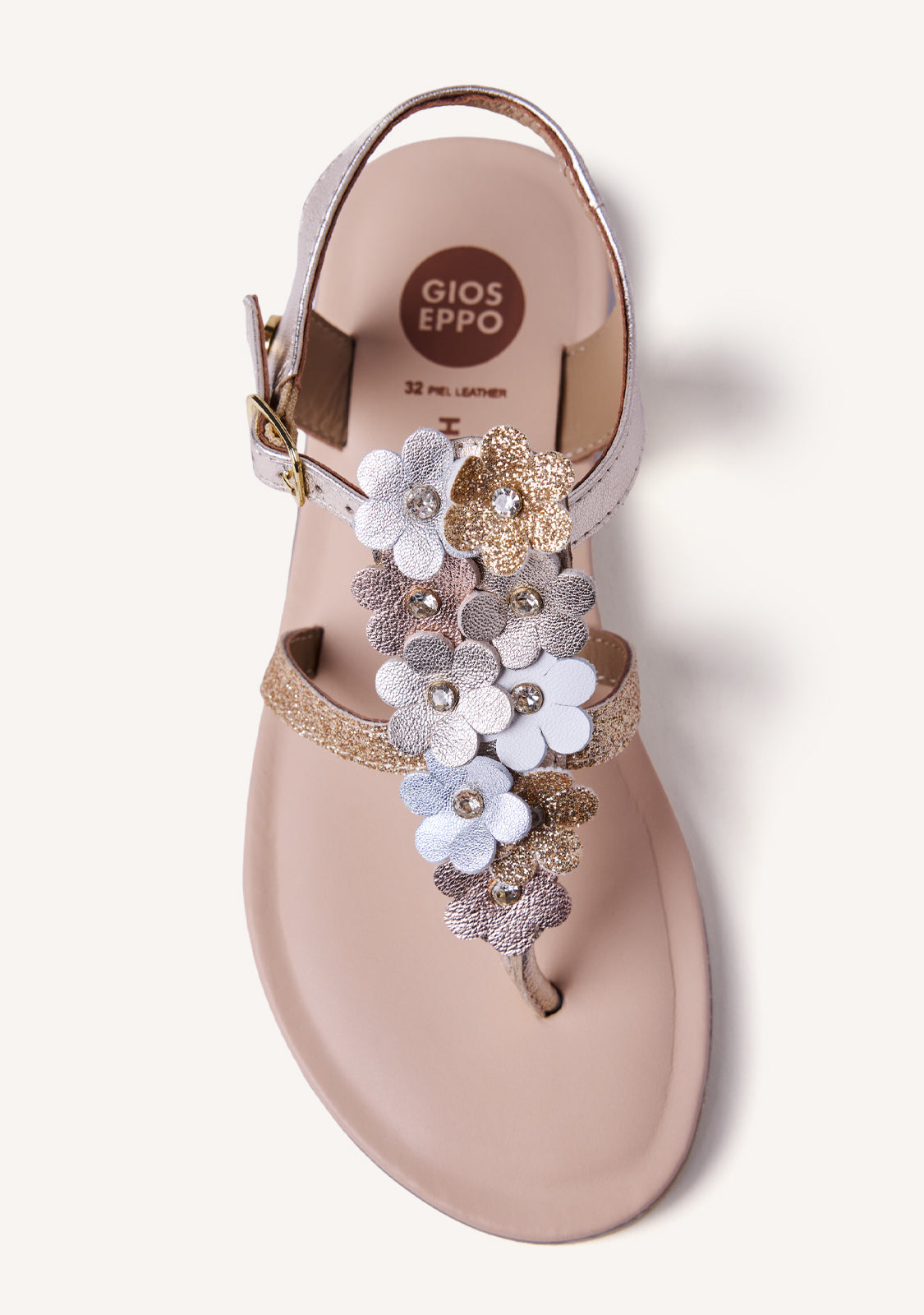Sandalias estilo giregas de piel metalizada con detalle multicolor de flores. Detalles brillantes. Cuentan con cierres ajustables en el tobillo y planta acolchada. Las posibles arrugas y diferencias en la piel o en el montado entre ambos pies son debidas al proceso artesanal y al uso de pieles naturales.