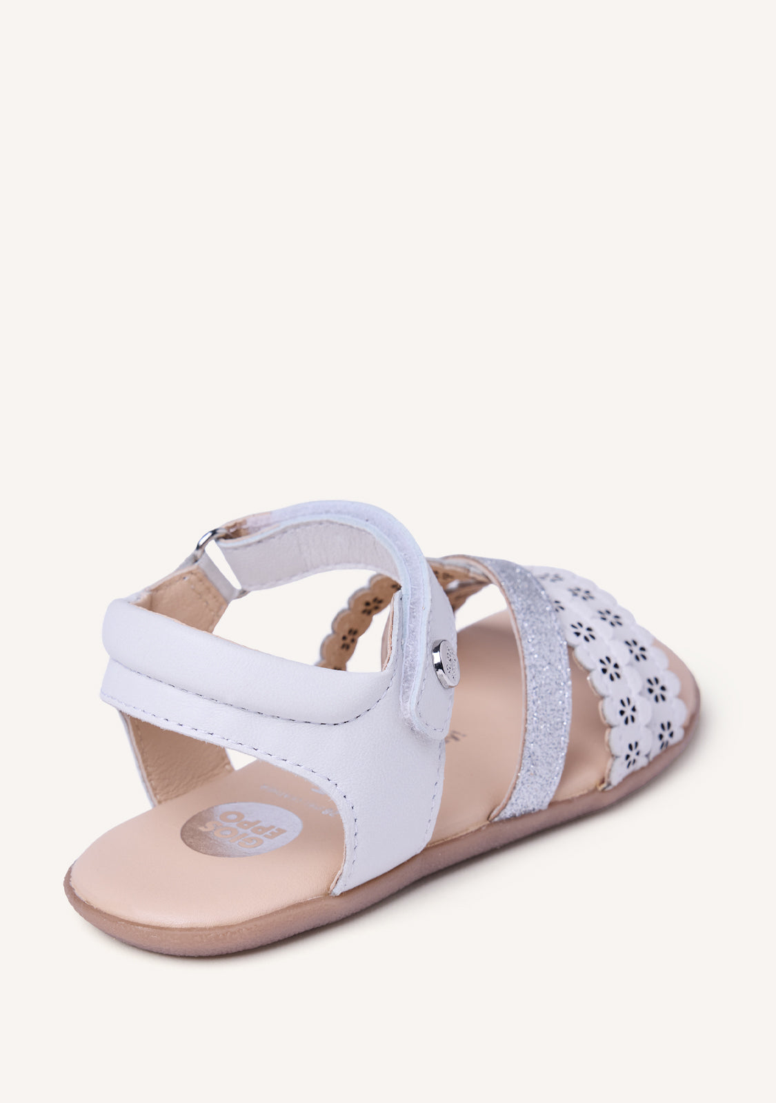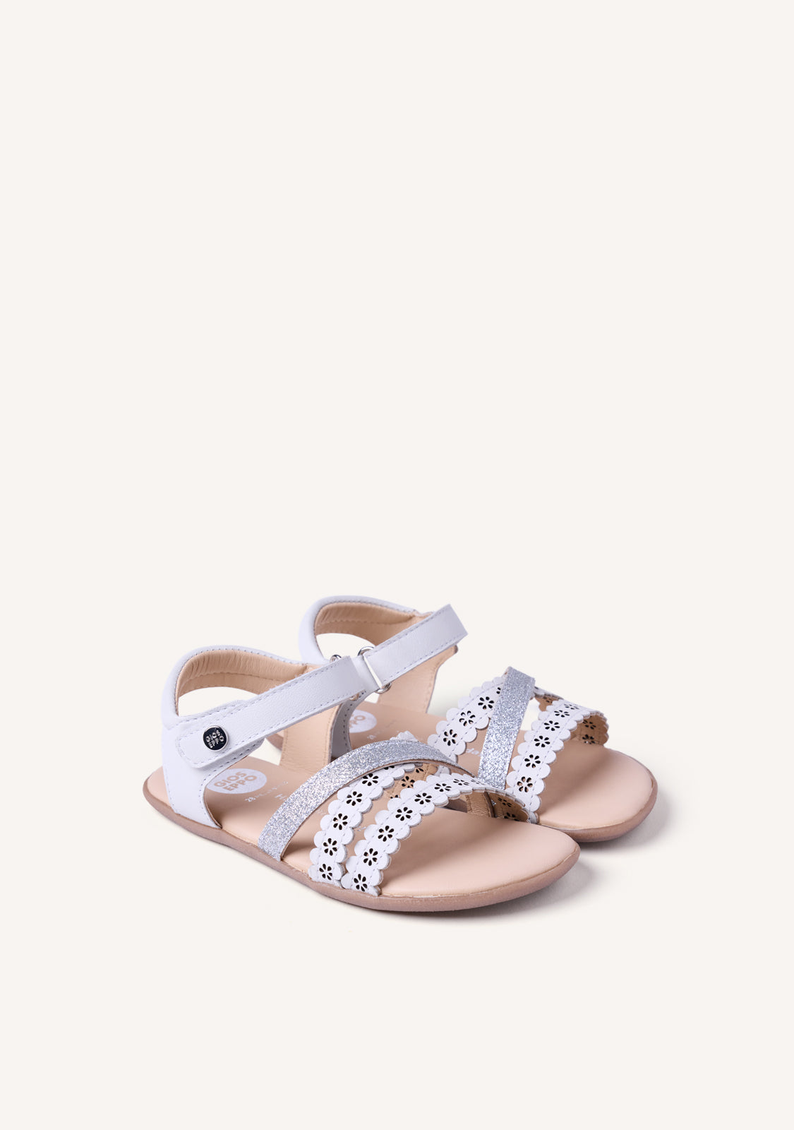 Sandalias de piel calada con flores y detalles brillantes. Diseñadas siguiendo las tendencias minimalistas para garantizar la pisada natural. Cuentan con cierres ajustables en el tobillo.