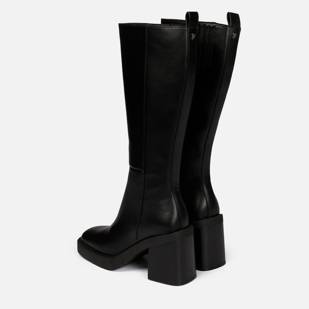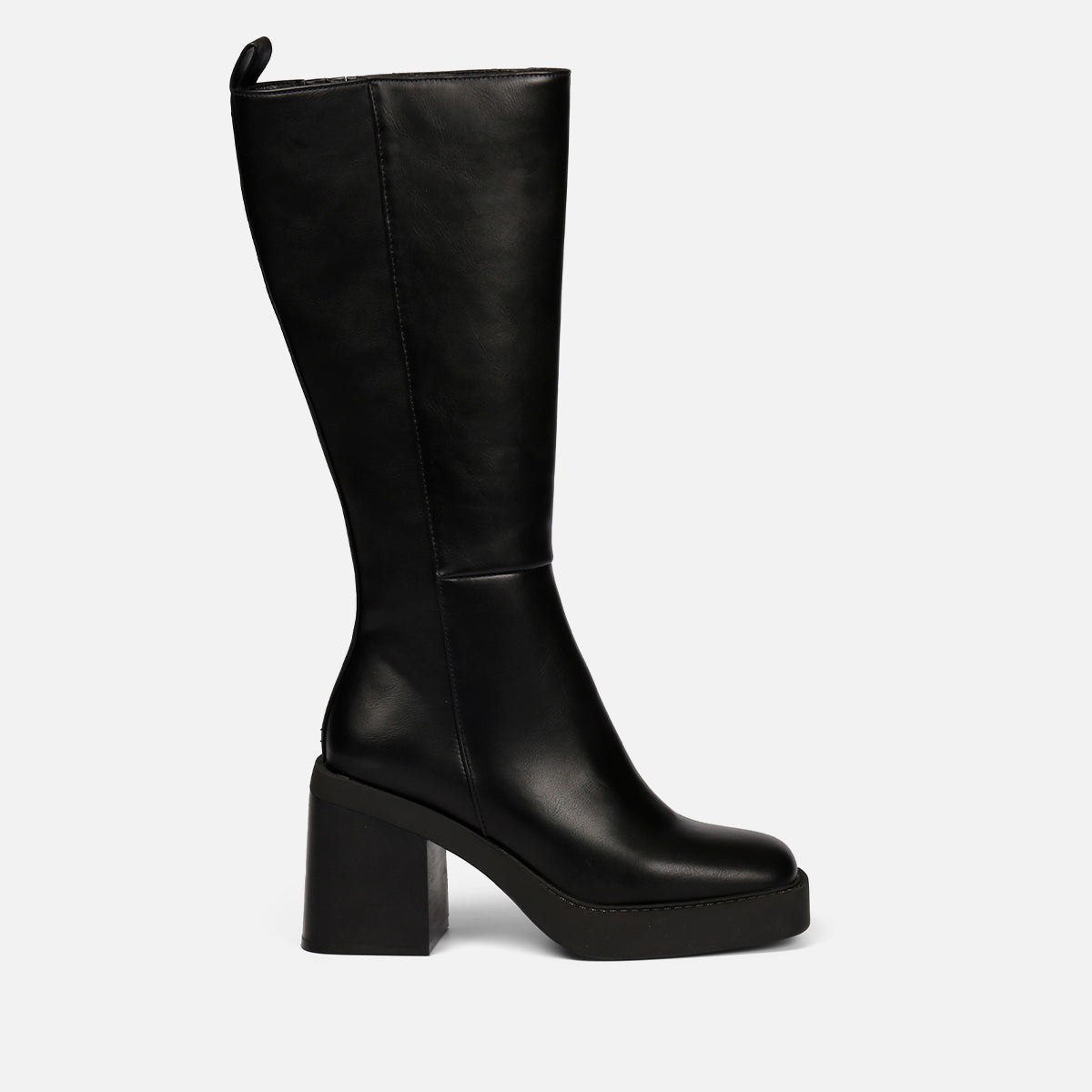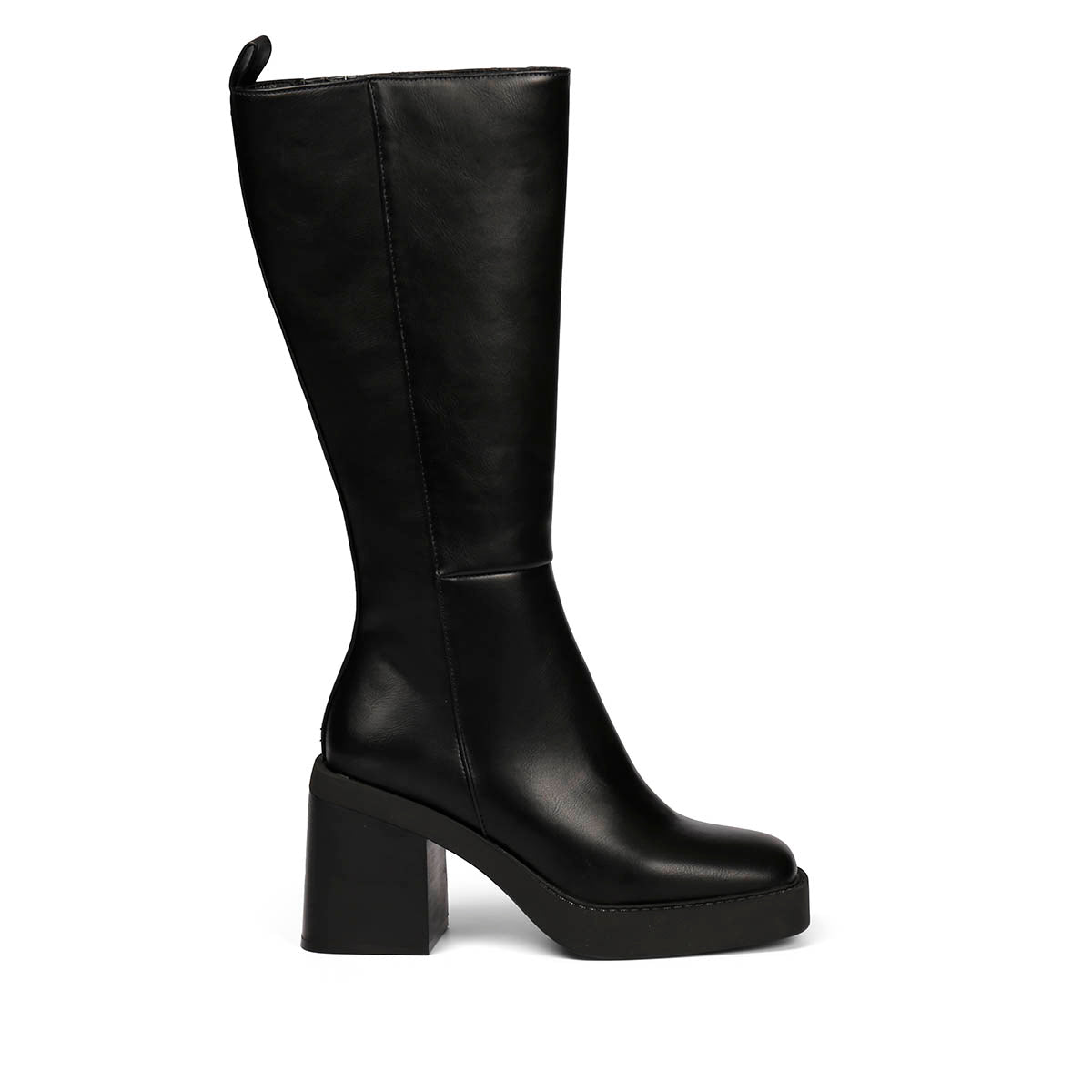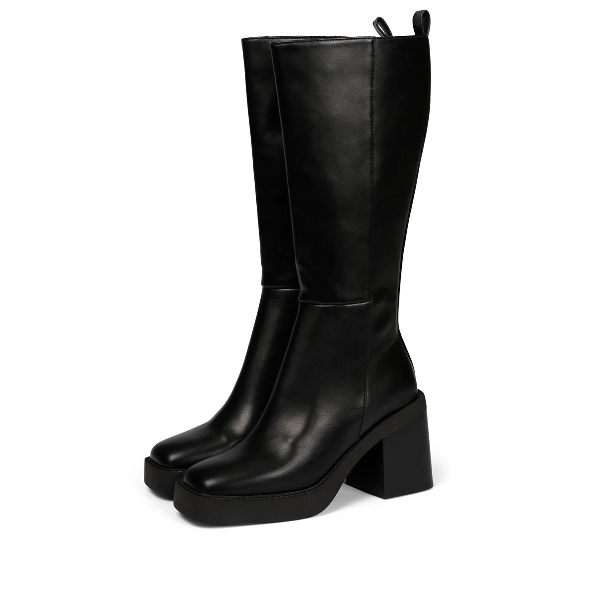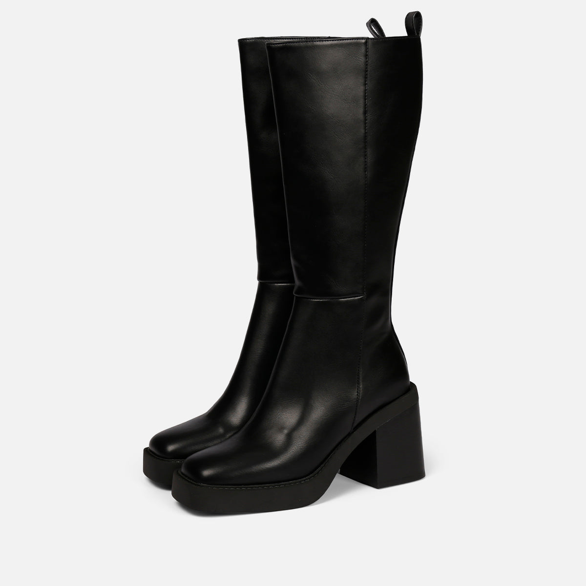¡Serán tu mejor fichaje este 2023! Bota negra alta lisa de punta cuadrada con plataforma gruesa y tacón ancho en material sintético. Planta de piel transpirable con acolchado confortable y forro de poliéster transpirable. Piso de caucho TPR.