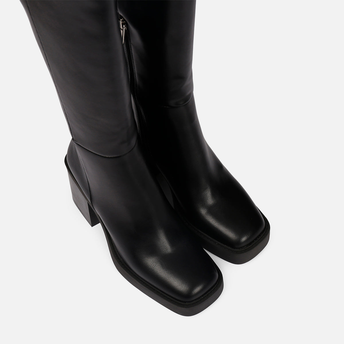 BOTA NEGRA ALTA LISA DE PUNTA CUADRADA CON PLATAFORMA GRUESA Y TACÓN ANCHO PARA MUJER GOEBLANGE