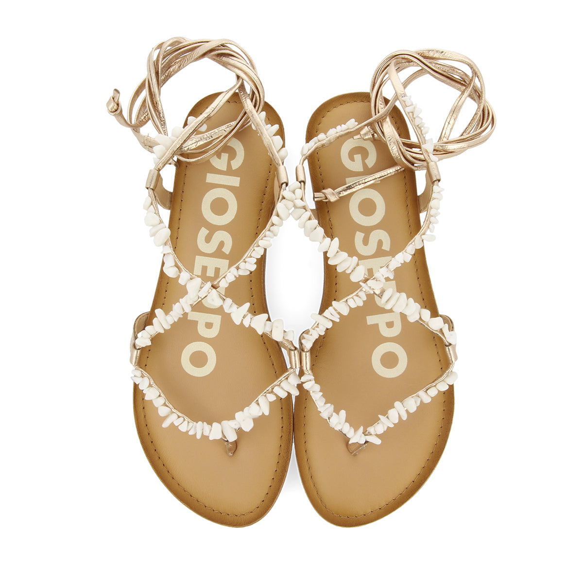 ¡100% estilo Gioseppo! Sandalias romanas color dorado con adornos blancos. Cierre al tobillo. Piel de la planta producida en tenerías que siguen un protocolo de curtición más sostenible según los estándares de Leather Working Group. Planta muy acolchada de látex. Forro de piel. Piso flexible. Descubre todas las novedades en sandalias para mujer en la nueva colección de SS22 de Gioseppo Woman.