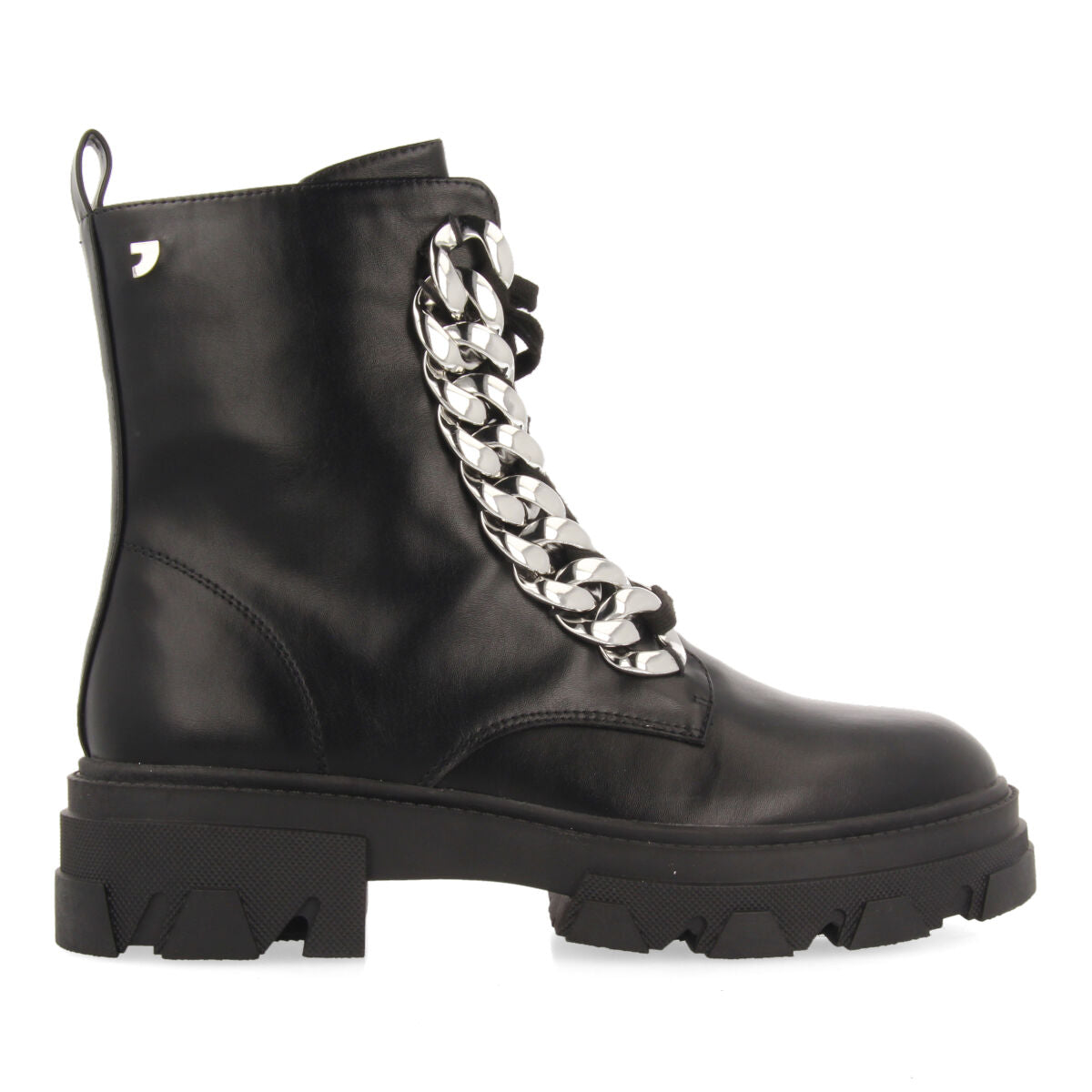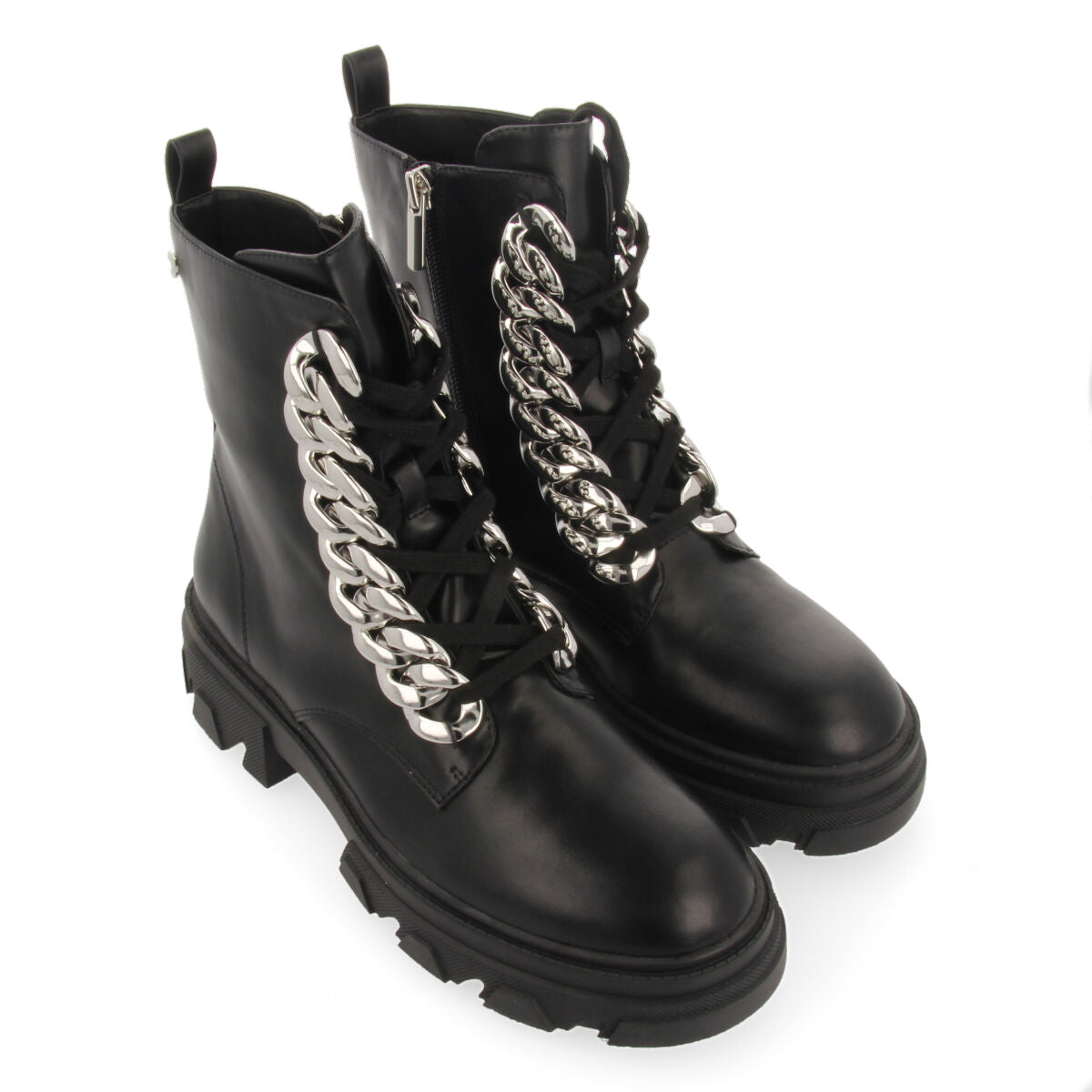 Los Botínes militares que necesitarás para todas la aventuras que te quedan por descubrir. Botín tipo militar negro de cordones con aplique de maxicadenas en las carrilleras. Tacón de 4,6 cm y caña de 14,5 cm de altura. Con material sintético de color negro y con piso track. Planta de piel transpirable con acolchado confortable y forro de poliéster transpirable. Piso de caucho TPR.