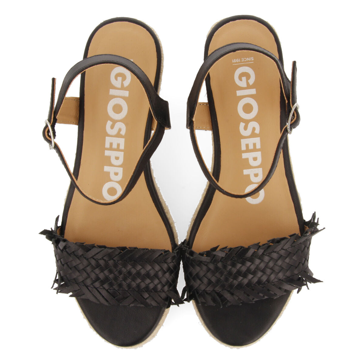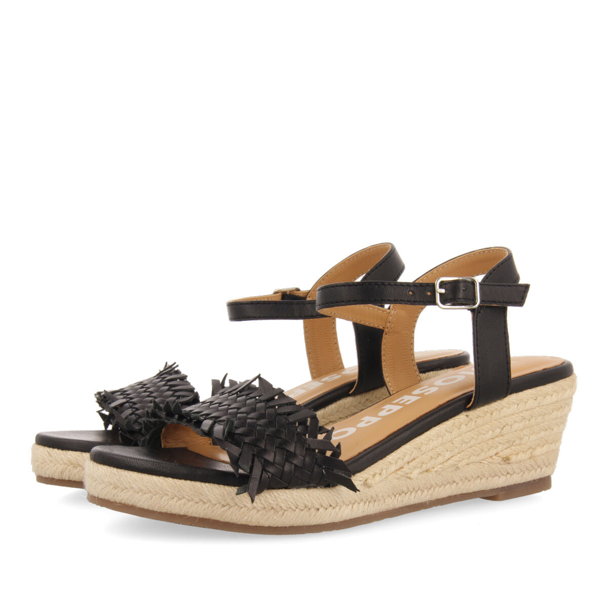 Uno de los modelos más cómodos de la temporada. Sandalias negras de cuña con pala trenzada color negro y cierre al tobillo con hebilla ajustable. Cuña forrada de yute. Plantilla de piel acolchada con látex para un mayor confort. Forro en piel. Piso flexible. Descubre la nueva colección de espadrilles para mujer en la nueva colección de Gioseppo Woman.