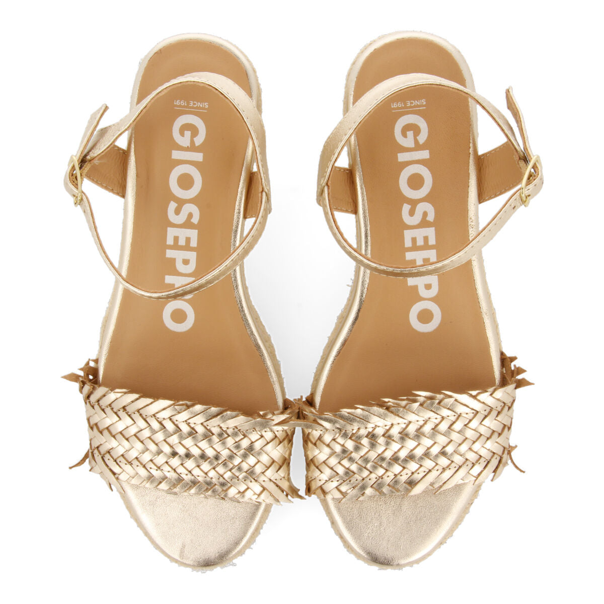 Uno de los modelos más cómodos de la temporada. Sandalias doradas de cuña con pala trenzada color negro y cierre al tobillo con hebilla ajustable. Cuña forrada de yute. Plantilla de piel acolchada con látex para un mayor confort. Forro en piel. Piso flexible. Descubre la nueva colección de espadrilles para mujer en la nueva colección de Gioseppo Woman.