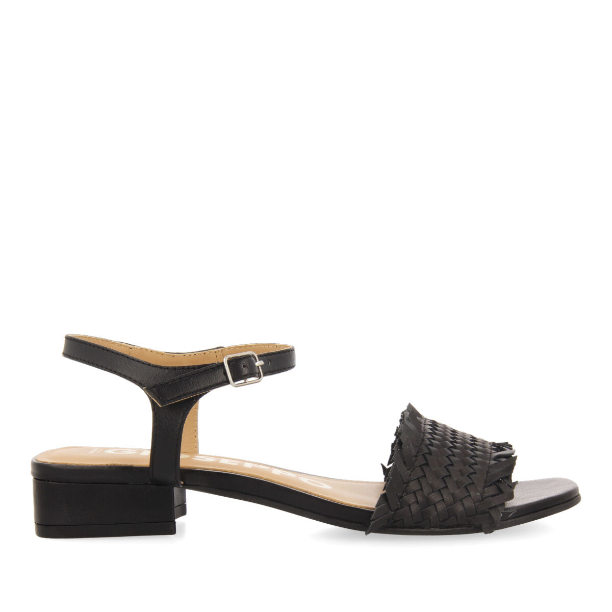 El toque trenzado las convierte en un modelo muy especial: Sandalias negras de tacón bajo de 2,5 cm con pala de piel trenzada y pulsera de tira fina con hebilla ajustable. Plantilla de piel acolchada de látex. Piso flexible.
