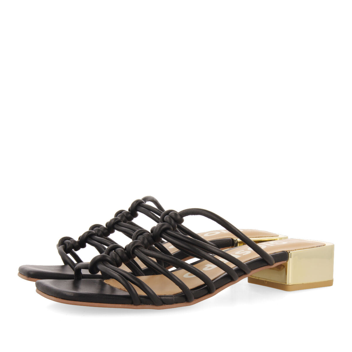 El modelo perfecto para las tardes de verano. Sandalias negras de piel con tiras finas formando nudos y tacón bajo cuadrado de 3 cm en tono metalizado. La plantilla es de piel muy acolchada con látex. El forro también es de piel y el piso flexible. No te pierdas la nueva colección de sandalias de tacón para mujer en la nueva colección de Gioseppo Woman.