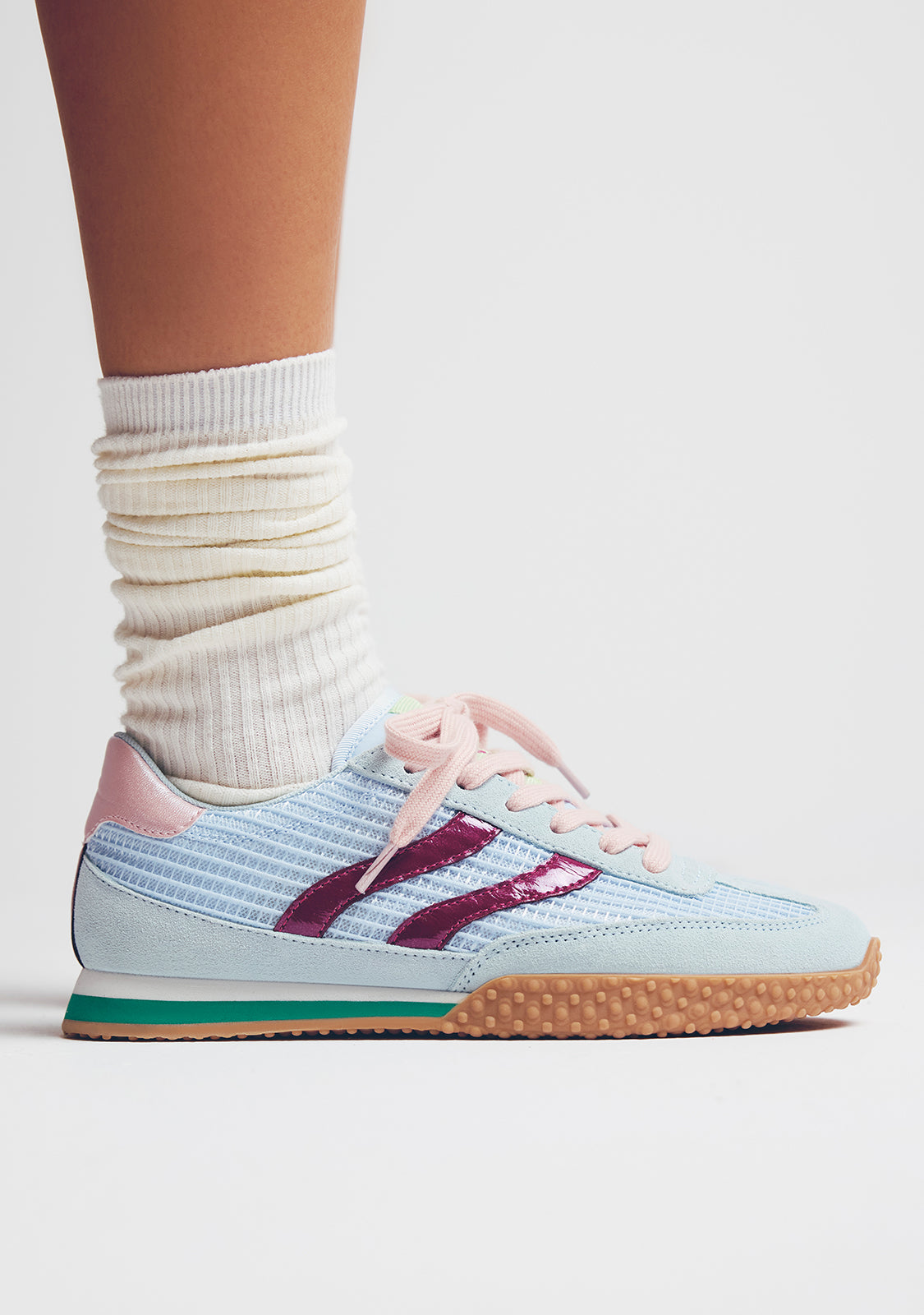 Zapatillas con piel serraje, rejilla superpuesta y acentos de color. Suela granulada. Cuentan con plantilla acolchada y extraíble. Altura plataforma: 2 cm.