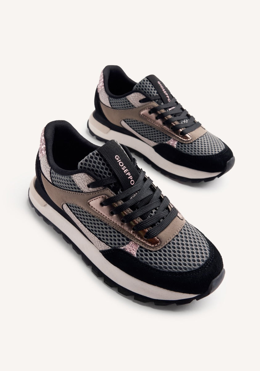 - Corte de piel, poliéster transpirable, poliuretano y glitter.