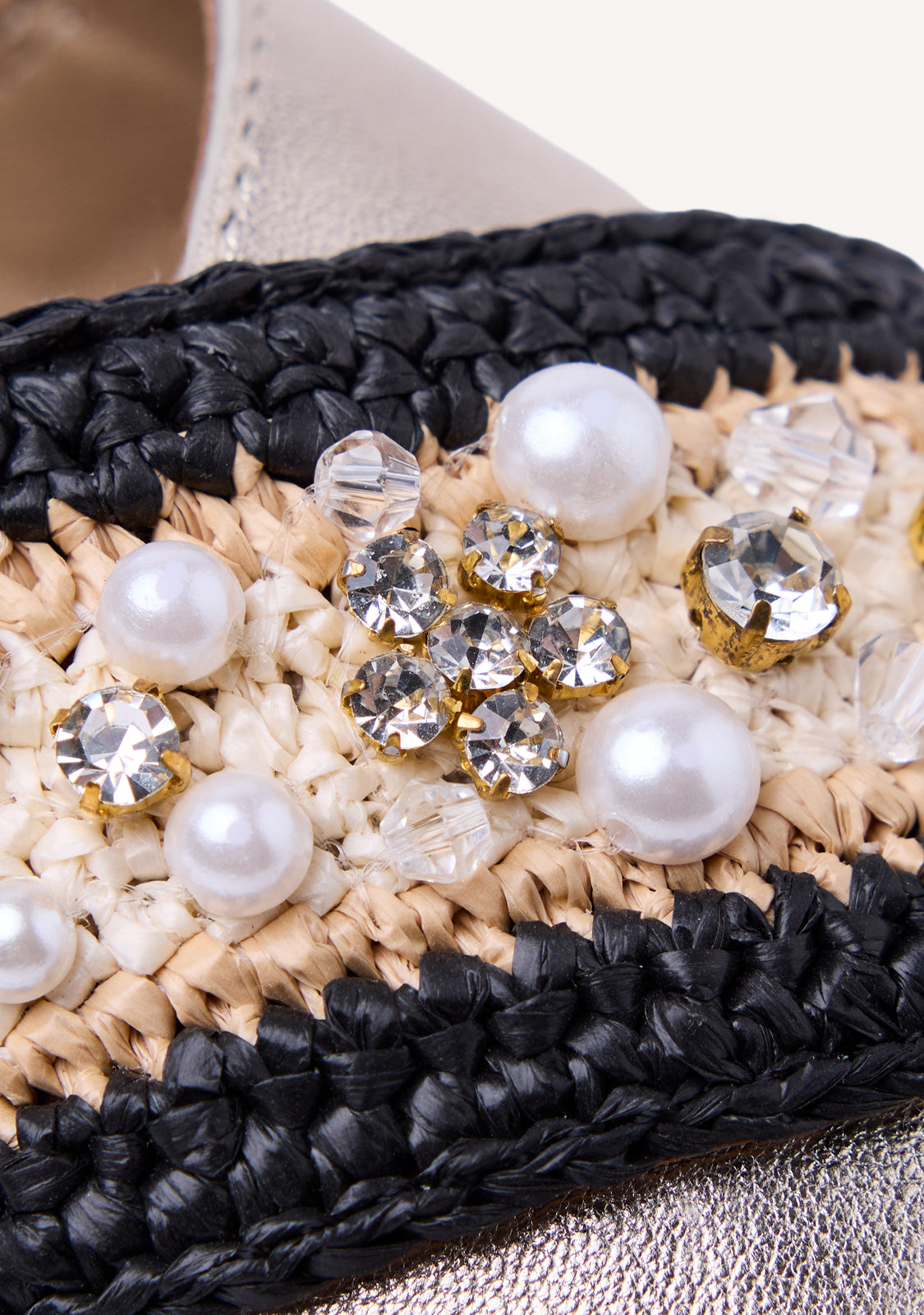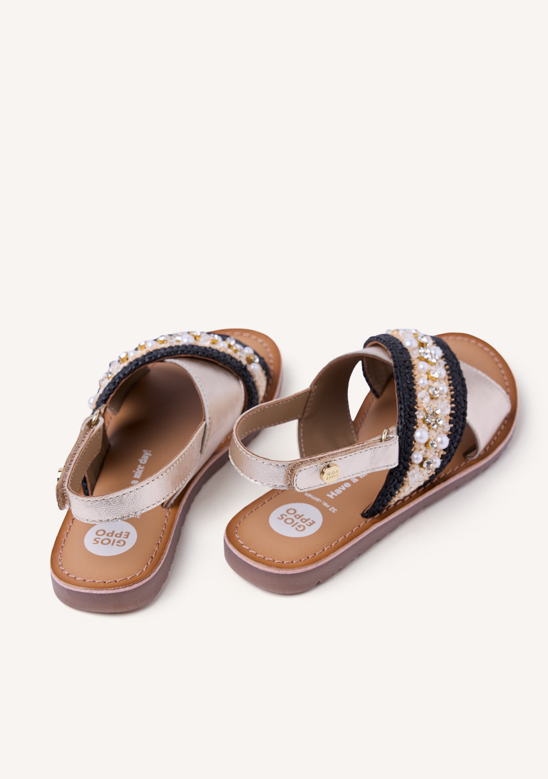 Sandalias de piel metalizada con rafia Adorno de perlas, pedrería y trenzado bicolor. Cuentan con cierres ajustables en el tobillo y planta acolchada. Las posibles arrugas y diferencias en la piel o en el montado entre ambos pies son debidas al proceso artesanal y al uso de pieles naturales.