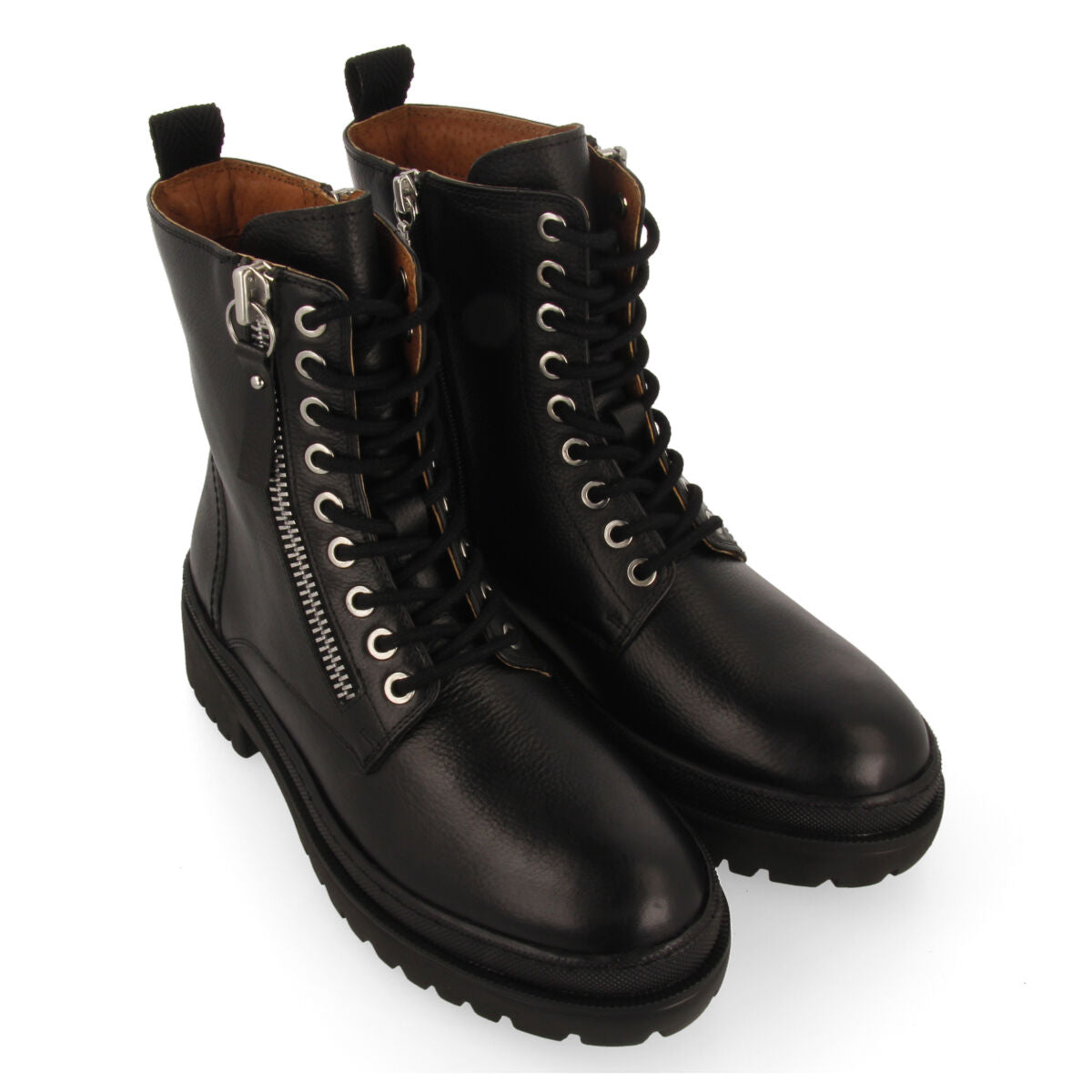 ¡Vuelve el básico más atemporal! Botines negros tipo biker de cordones con piso track en piel. Planta con fibras naturales. Plantilla acolchada de látex y forro reciclado. Plantilla y forro de piel curtidos en tenerías que siguen un proceso de curtición más sostenible bajo los estándares de Leather Working Group. ¡Te enamorarán!