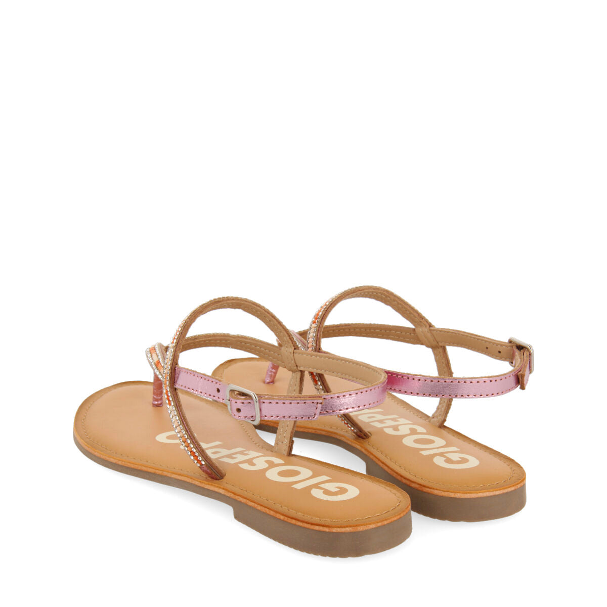 Sandalia de piel con tiras finas metalizadas en rosa con adorno multicolor de cuentas y cristales. Plantilla acolchada con látex. Piel de la planta curtida siguiendo un proceso de curtición más sostenible según los estándares de Leather Working Group. Tus sandalias favoritas están en la nueva colección de Gioseppo Woman.